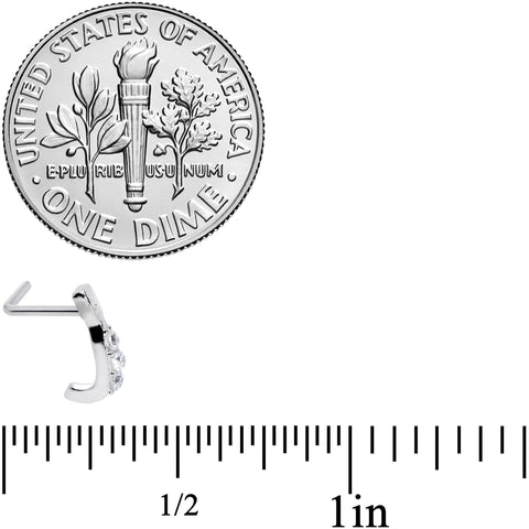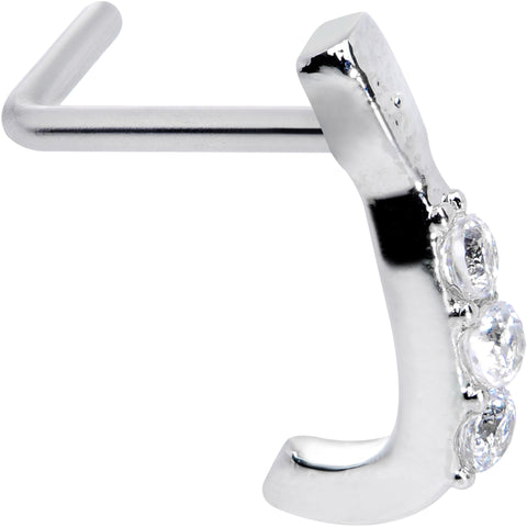 This 20 gauge nostril jewelry combines opulence and elegance for simple beauty! It's 8mm length at the bend and made with a 316L surgical grade stainless steel L-shaped post. It features a curving portion that emulates the look of a hoop while offering the fit of an L-shaped nose ring. The hoop portion is set with a trio of clear cubic zirconia gems for a look that's upscale but not over the top. Give a graceful makeover to your nostril piercing with this simple and stylish nose jewelry!Specifications