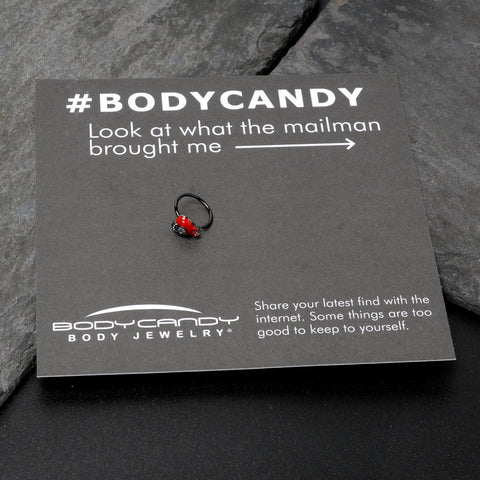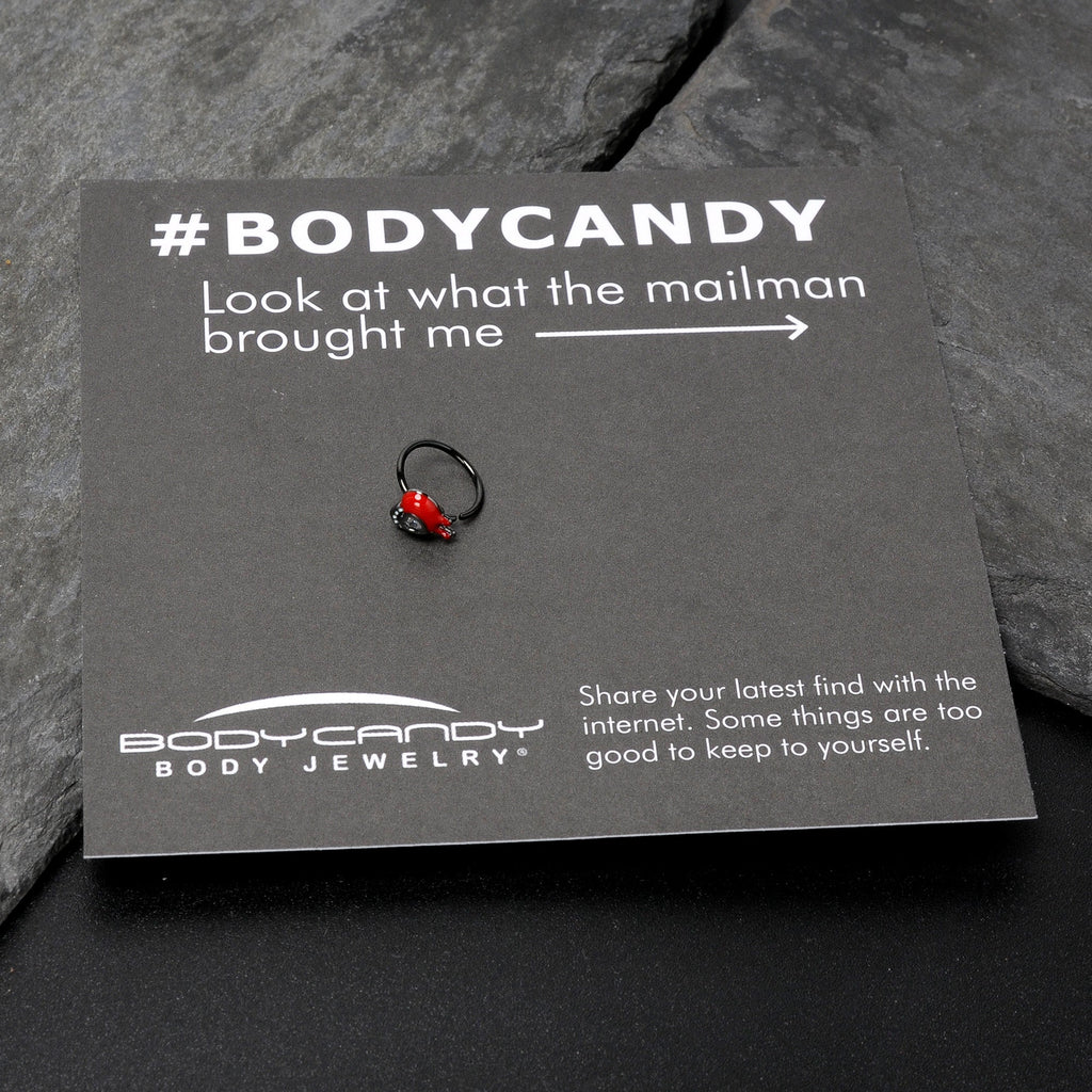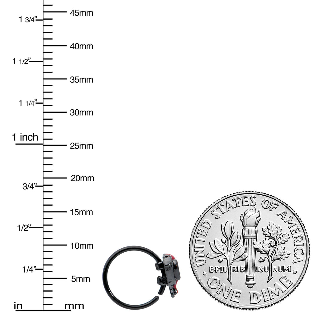 If you have been wounded by love, this 20 gauge nostril ring should be perfect for you. It is made with an 8mm black PVD over 316L surgical grade stainless steel circular ring. It features a heart charm, with one side embellished with white inlay dots. The other side is red and features a dripping effect as if the heart were bleeding. It has a clear gem heart at the center for added style. Wear your heartache with style when you are rocking this strikingly symbolic nose piercing ring.Specifications
