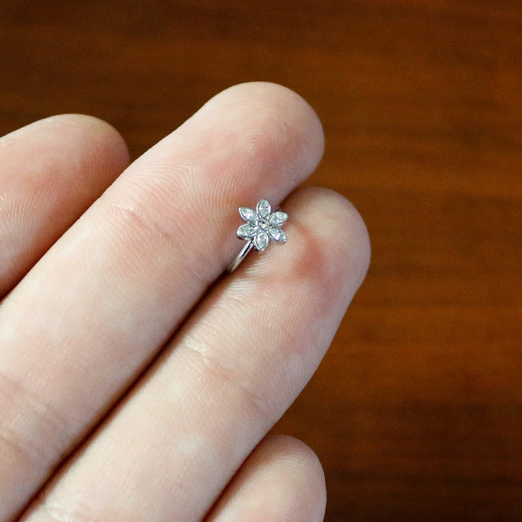The elegant flower on this 20 gauge nose jewelry is sure to put some spring in your look! It's made with an 8mm durable 316L surgical grade stainless steel circular ring. It features a flower charm, composed of clear gem petals for a look that's both stylish and a bit whimsical. It's easy to insert and remove - Just give it a light twist, insert it into your piercing and gently bend it closed. This fancy flower will add colorful style to your nostril piercing no matter what the season!Specifications