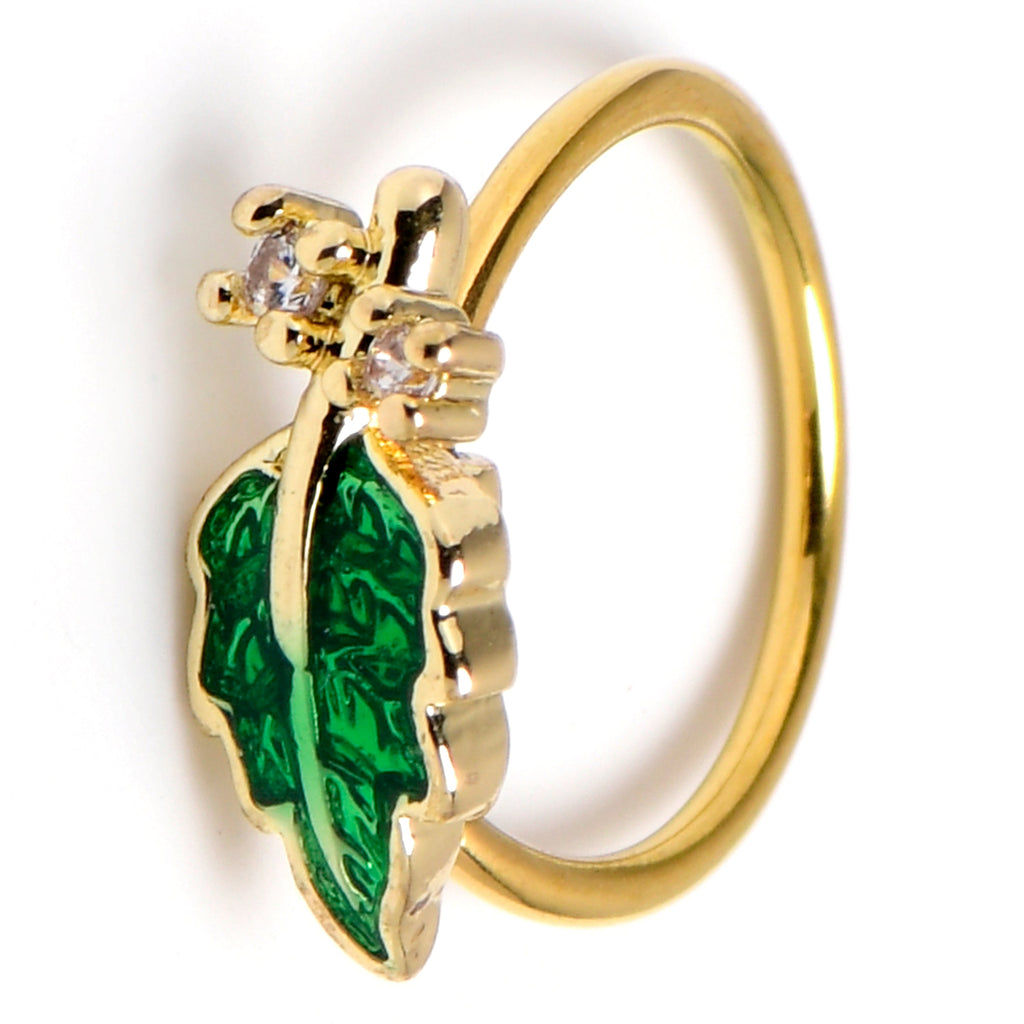 Here is a bit of nature you will never leaf behind when you rock this 20 gauge nostril ring. It is made with an 8mm gold tone PVD over 316L surgical grade stainless steel circular ring. It features a leaf charm, with deep green inlay and gold tone detailing. It also features a clear gem embellishment at one side of the base. Get your nature on with this awesome, arboreal nose piercing jewelry.Specifications