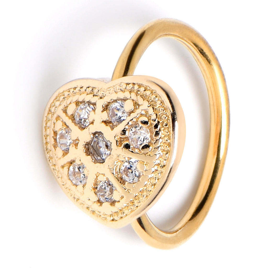 Look luxe without breaking the bank with this 20 gauge nostril ring. It is made with an 8mm gold tone PVD over 316L surgical grade stainless steel circular ring. It end features a heart charm, with ornate detailing and clear gems all along the interior. You are going to fall in love with the baroque look of this heart-themed nose piercing jewelry.Specifications