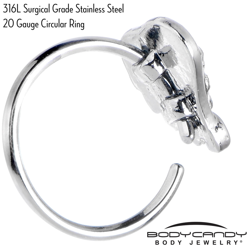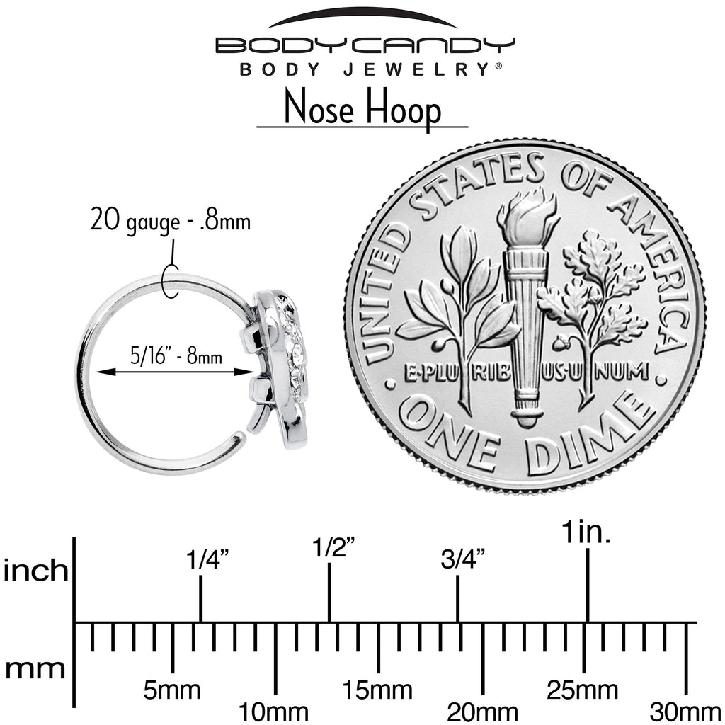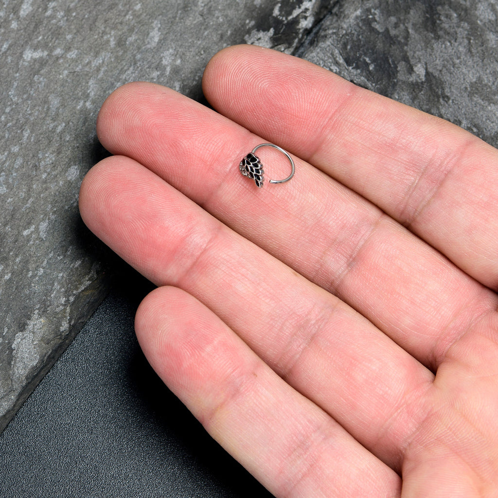 Give yourself a heavenly new look with this 20 gauge nostril ring. It's made with an 8mm durable 316L surgical grade stainless steel circular ring. It features a heart shaped charm featuring an angel's wings, with one side paved with clear gems. The other side features black inlay and simply styled feather details. Let your look and your spirit soar with this stylish and spiritual nose piercing jewelry.