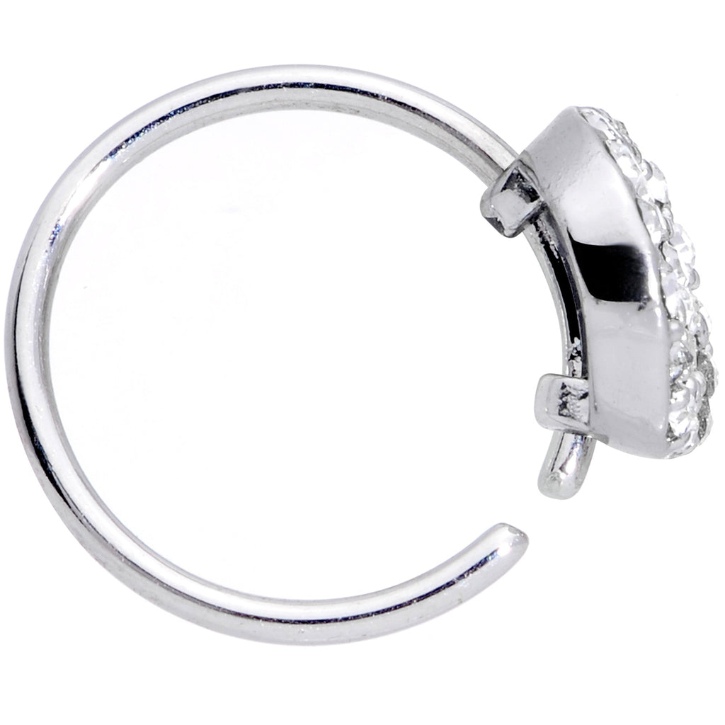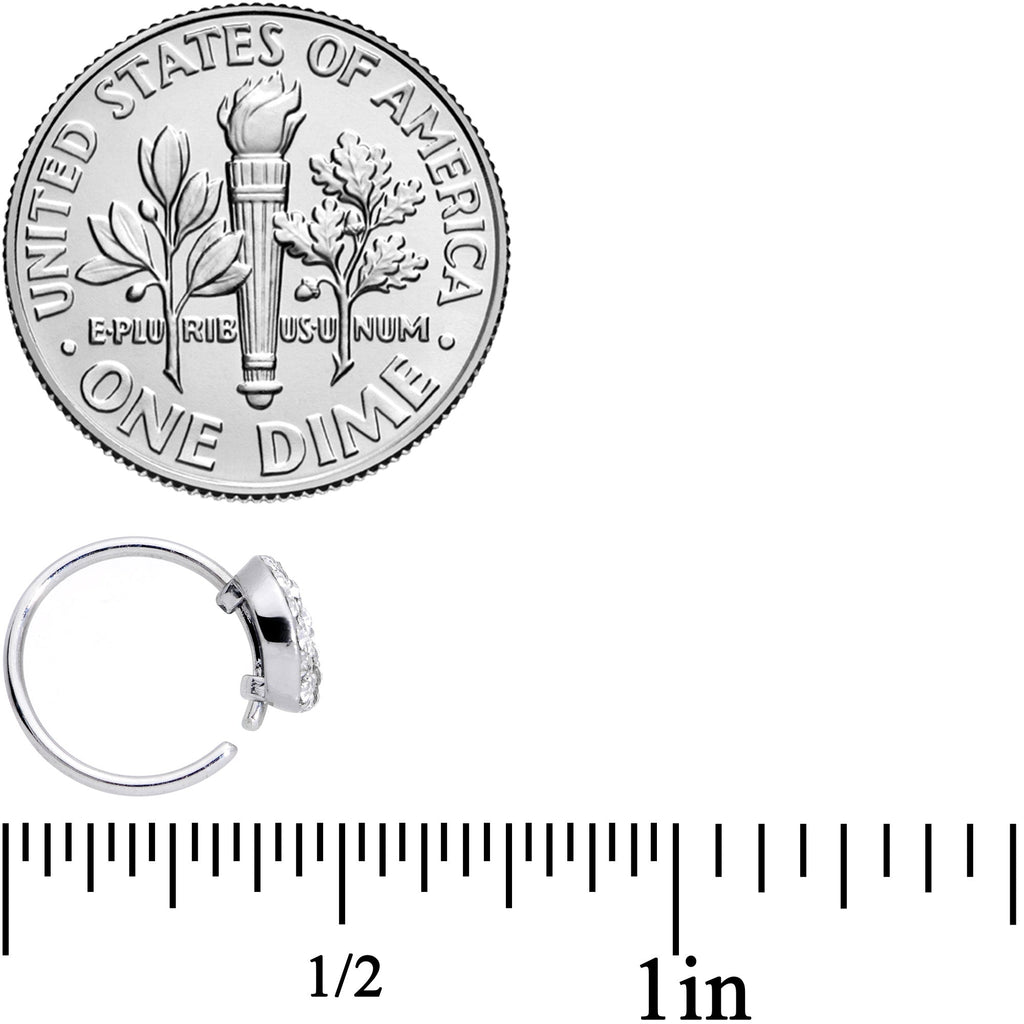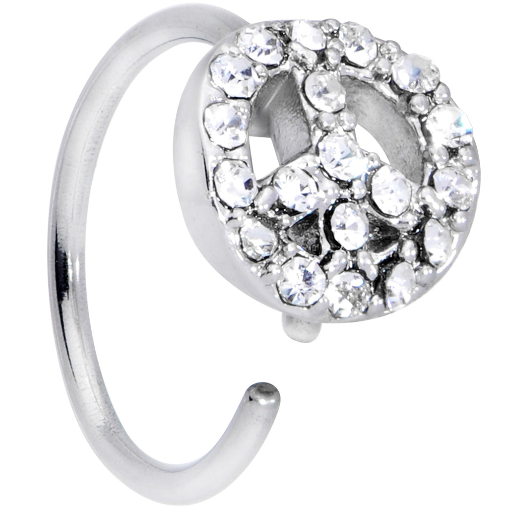 Why make war when peace looks this good? This 20 gauge nose ring is made with an 8mm durable 316L surgical grade stainless steel circular ring and features a peace sign charm paved in clear gems for a look that mixes politics with panache. And because peace is contagious, this peace sign body jewelry works well in some ear lobe piercings as well. To insert, simply twist open, insert, and gently twist shut again. This nostril jewelry is sure to make you a happy hippie!Specifications