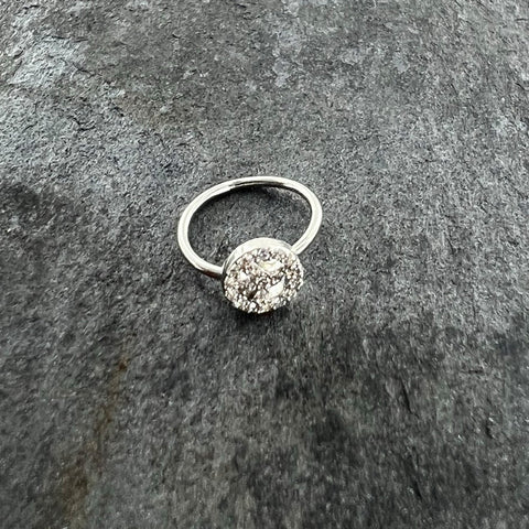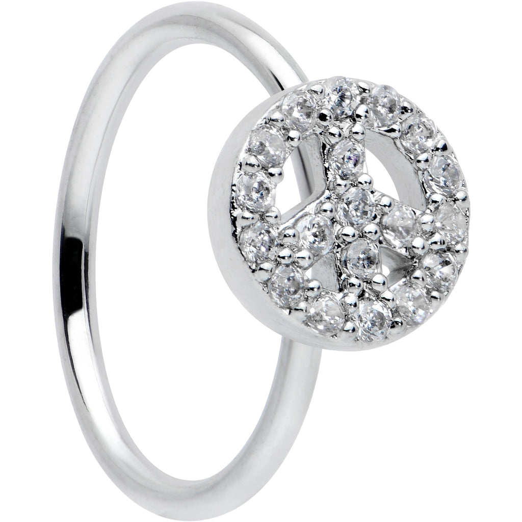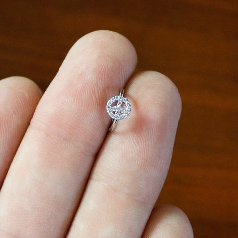 Why make war when peace looks this good? This 20 gauge nose ring is made with an 8mm durable 316L surgical grade stainless steel circular ring and features a peace sign charm paved in clear gems for a look that mixes politics with panache. And because peace is contagious, this peace sign body jewelry works well in some ear lobe piercings as well. To insert, simply twist open, insert, and gently twist shut again. This nostril jewelry is sure to make you a happy hippie!Specifications