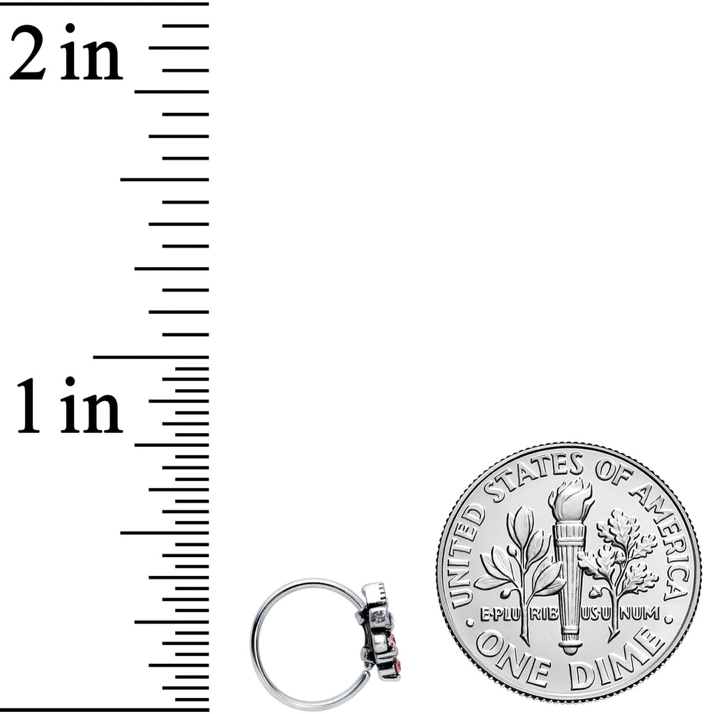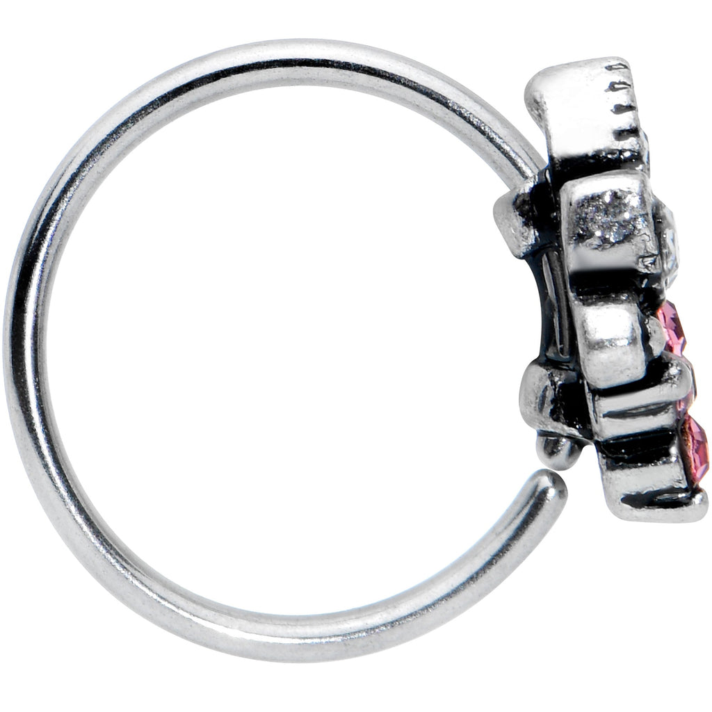 Get a little abstract with this 20 gauge nostril ring! It's made with an 8mm durable 316L surgical grade stainless steel circular ring. It features a geometric charm featuring of ovals. Each oval is set with a clear gem and the whole charm is embellished with a pink gem flower. It's further embellished with textured detailing, burnished to make all the details pop. Add some abstract opulence to your look with this elegant, opulent nose piercing ring.