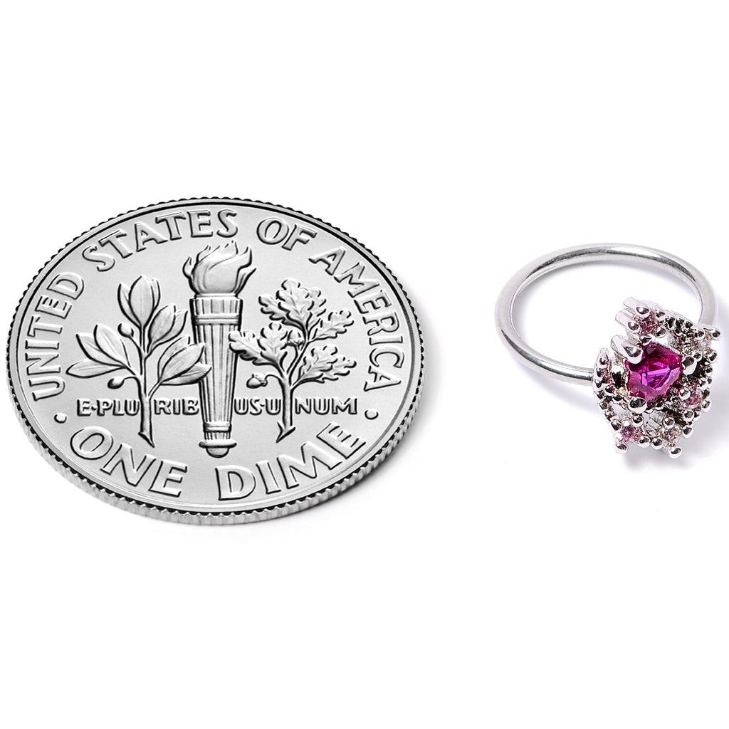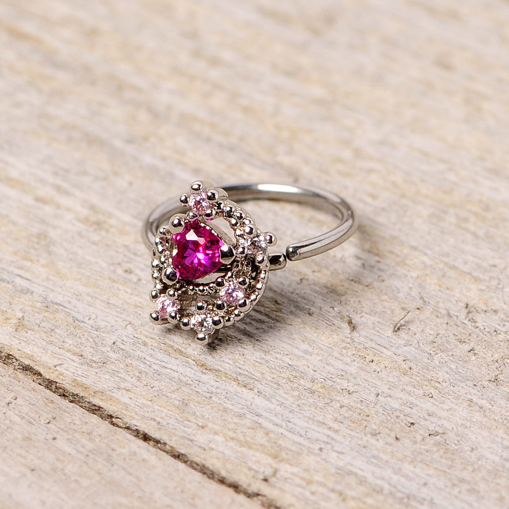 This 20 gauge nose ring will have you over the moon! It's made with an 8mm durable 316L surgical grade stainless steel circular ring. It features a crescent moon charm set with tiny clear gems and with a tiny shooting star detail at the bottom. The moon is encircling a deep pink gem for gorgeous color contrast that adds visibility to such a petite piece. This nostril jewelry is sure to be a star!Specifications