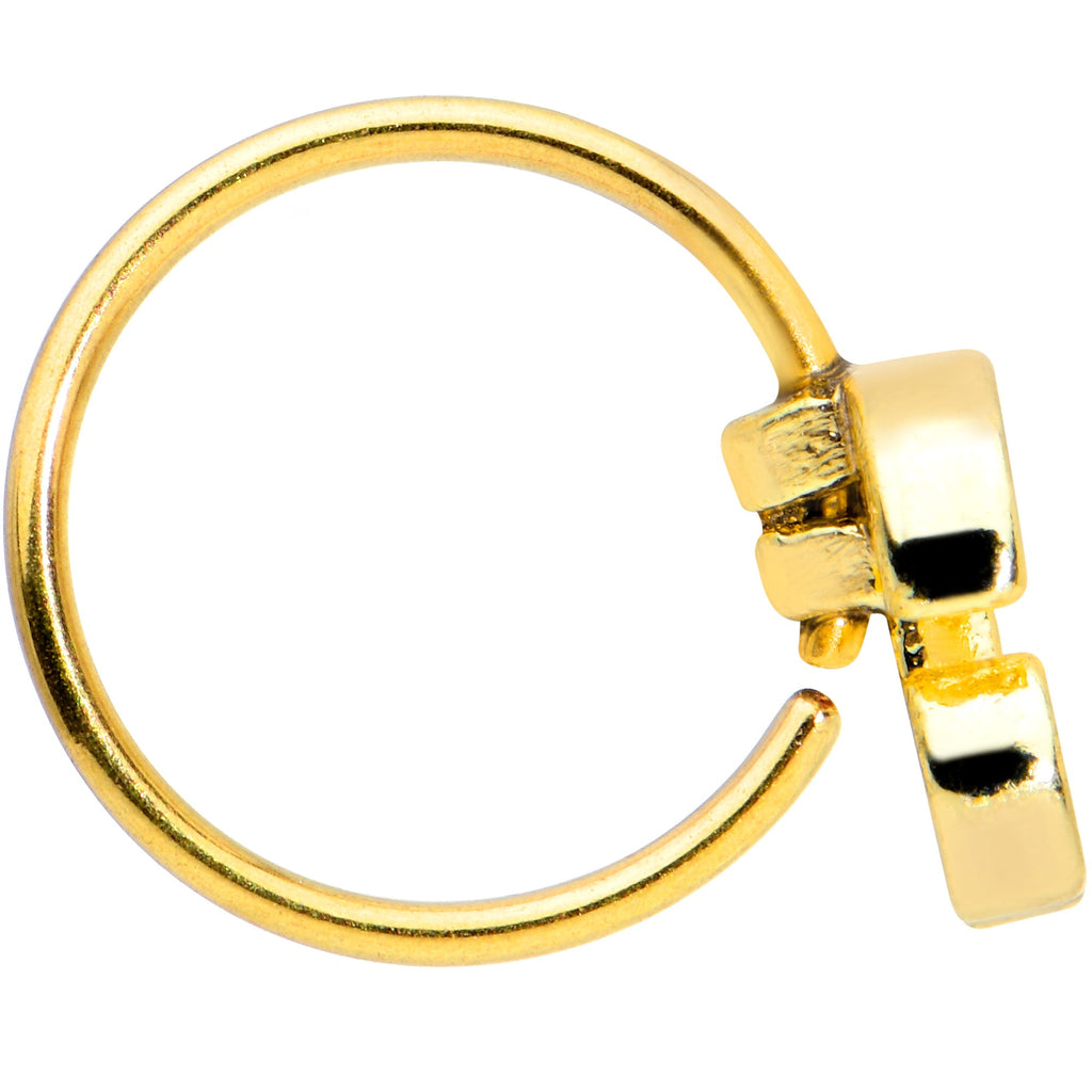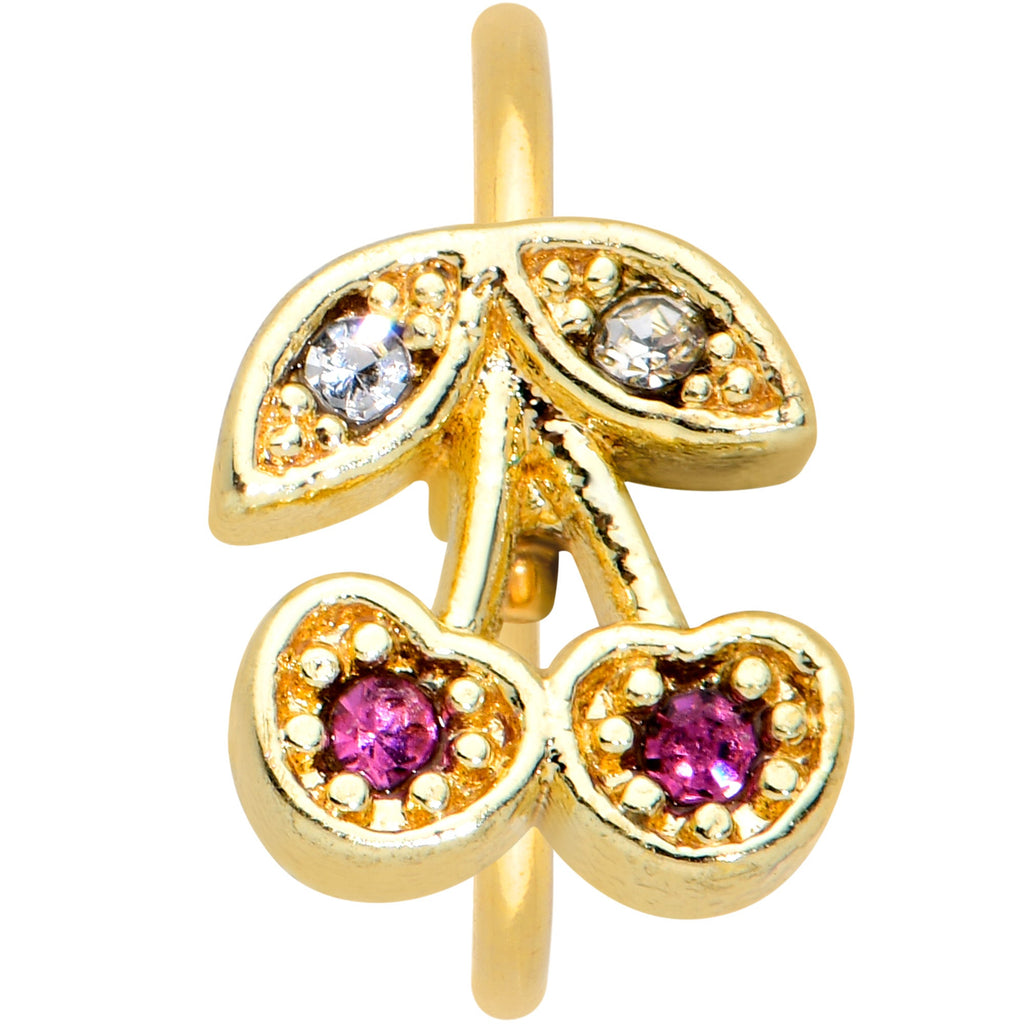 Give your nose piercing a look that's absolutely delicious with this sweet 20 gauge nostril ring! It's made with an 8mm gold tone PVD over 316L surgical grade stainless steel circular ring. It features a cherry charm. They feature a pair of leaves, set with clear gems. Beneath the leaves are two stems, each ending with a cherry which are set with purple gems for a realistic appearance. Your nostril piercing will be looking very cherry indeed with this sweet fruit-themed nose ring!Specifications