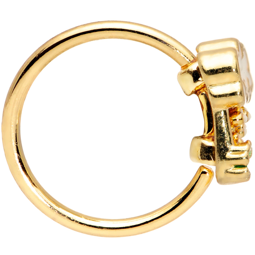 Celebrate St Patrick's Day with a bubbly mug of beer....in your nostril piercing with this 20 gauge nose ring! It's made with an 8mm gold tone plated over 316L surgical grade stainless steel circular ring. It features a mug of beer charm, with white orbs to mimic drops of foam on the mug. It's further embellished with a green shamrock in one corner. Let your nose piercing raise a cold one this St Patrick's Day with this beer mug nostril jewelry!Specifications