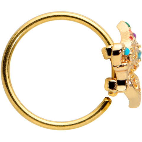 Fall in love with your nose piercing when you're rocking this 20 gauge nostril ring! It's made with an 8mm gold tone PVD over 316L surgical grade stainless steel circular ring. It features a butterfly charm with hearts within its openwork wings, embellished with color inlays in red, green, blue, and more! This nostril jewelry is sure to steal your heart!Specifications