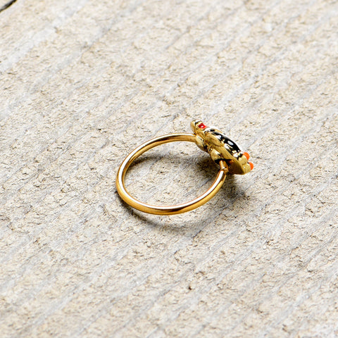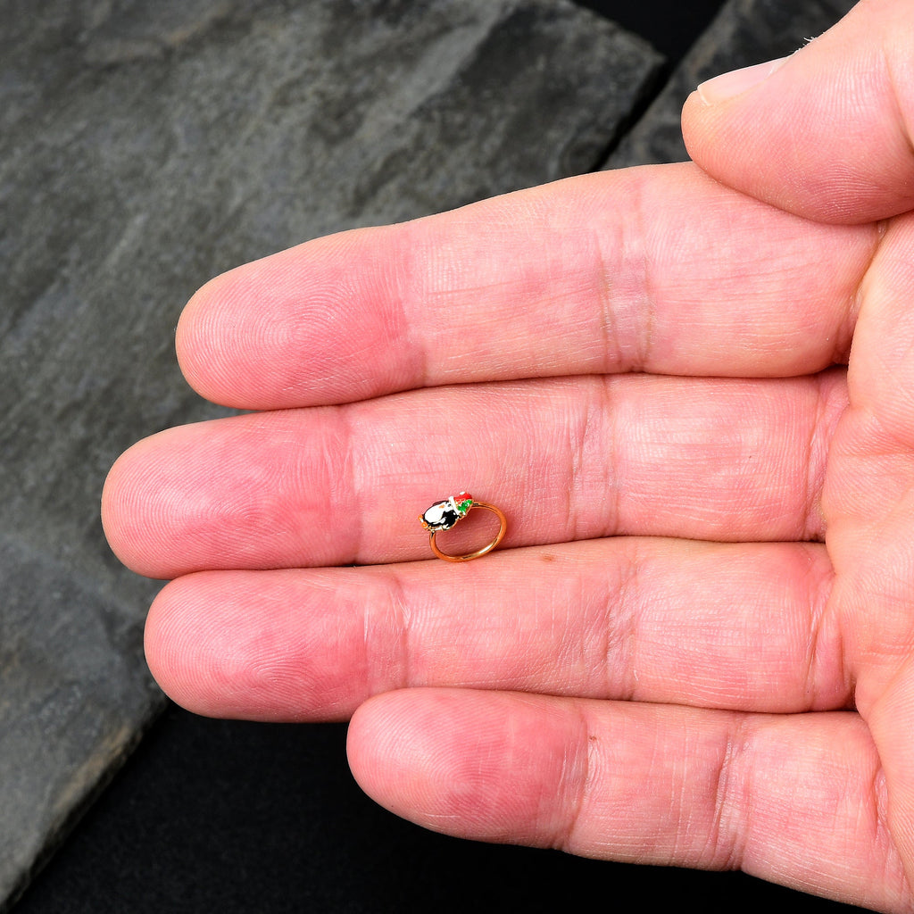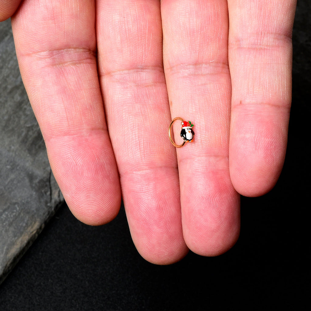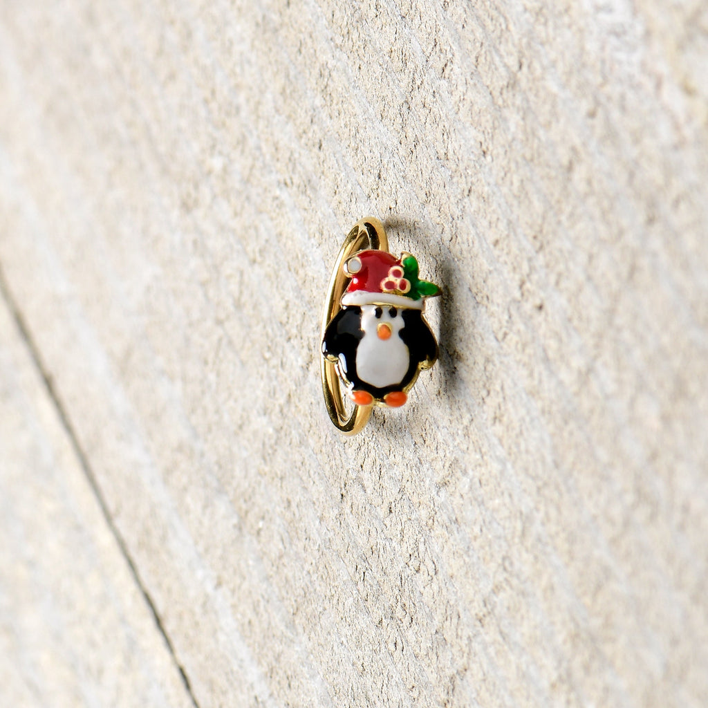 You want to dress to impress for the holidays, like the penguin on this 20 gauge nostril ring! It's made with an 8mm gold tone PVD over 316L surgical grade stainless steel circular ring. It features a penguin charm, with the penguin rocking its traditional black and white. The penguin is also sporting a festive Santa cap, embellished with a sprig of holly. You'll be rocking your finest when you're rocking this merry penguin nose piercing jewelry.Specifications