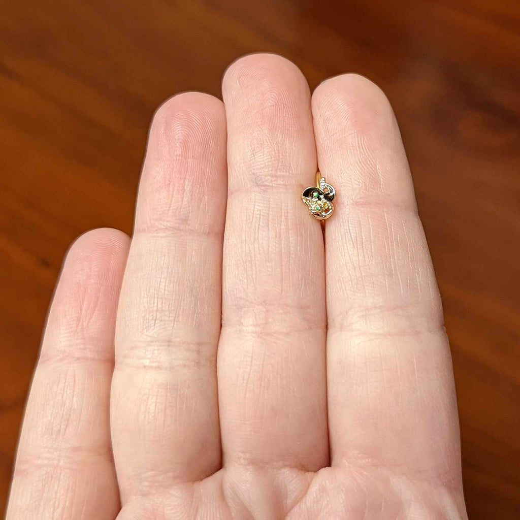 The whales on this 20 gauge nostril ring show that style runs in the family! It's made with an 8mm gold tone PVD over 316L surgical grade stainless steel circular ring. It features a whale charm, with a mother whale and baby. The mother has black embellishment and a green eye while the baby is set with textured detailing and also has a green eye embellishment. Show your love for these gorgeous creatures family-style with this wonderful whale-themed nose piercing ring!Specifications