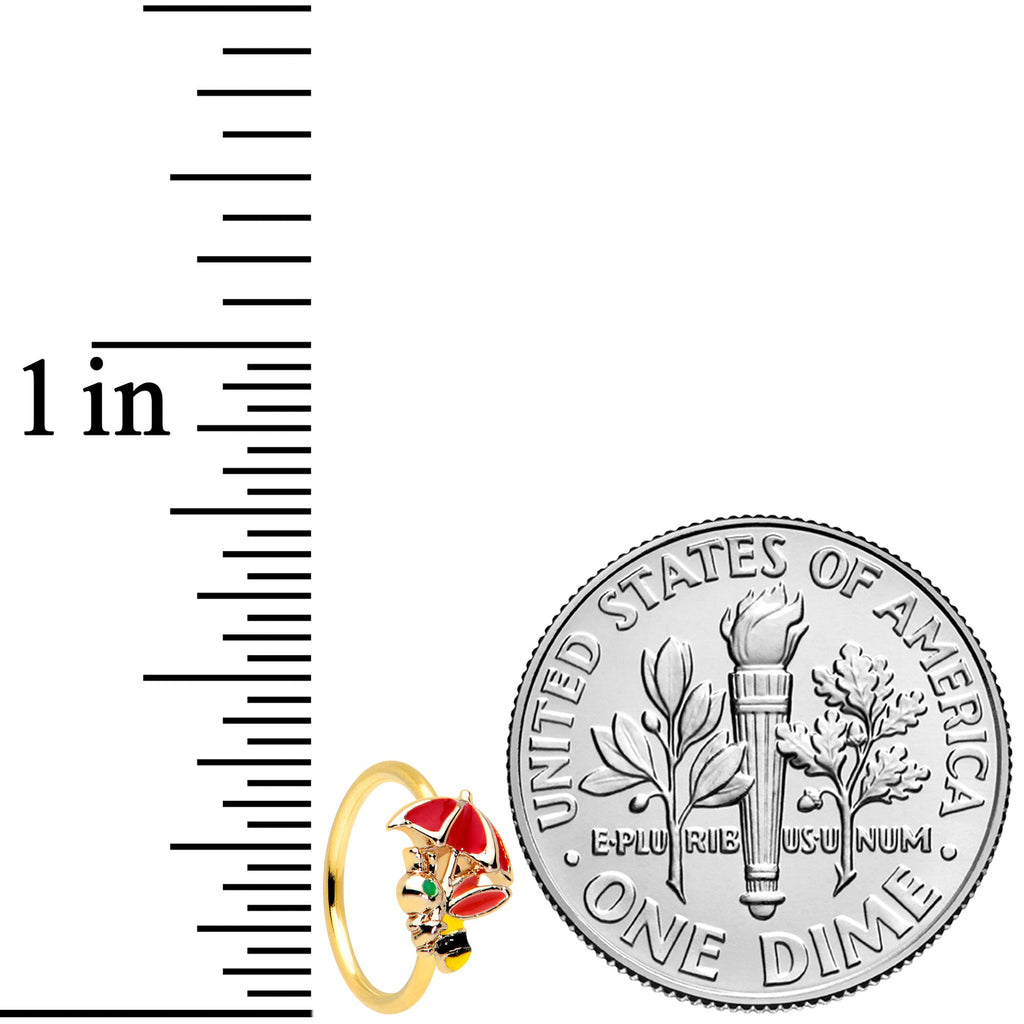 Even rainy days can bee beautiful, like on this 20 gauge nostril ring! It's made with an 8mm gold tone PVD over 316L surgical grade stainless steel circular ring. It features a bee charm, inlaid in yellow and black. The bee is carrying a red umbrella and features matching red embellishment on its wings. It also features a green eye for an added touch of style and color! This is one honey of a nose piercing ring!