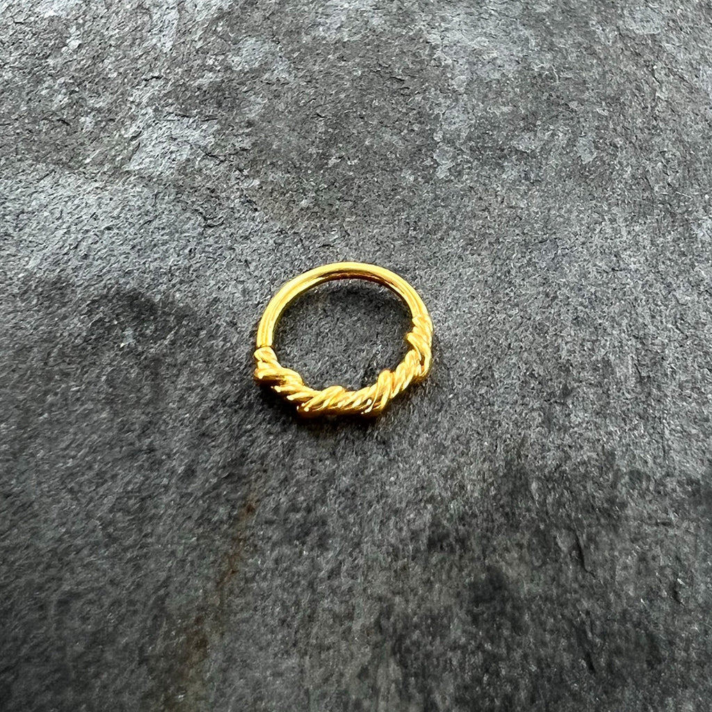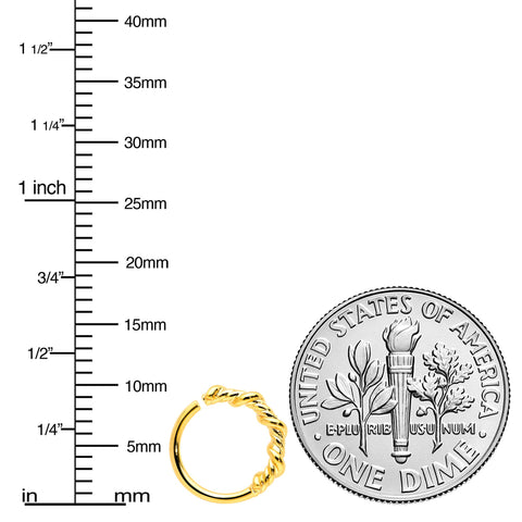 Get wired for style with this 20 gauge nostril ring! It's made with an 8mm gold tone electroplated over 316L surgical grade stainless steel circular ring. It features a wire-inspired style that looks twisted, for a look that's totally wild. It's easy to insert and remove - Just give it a light twist, insert it into your piercing and gently bend it closed. This wire-styled nose piercing ring is one you'll never want to cut from your jewelry wardrobe!Specifications