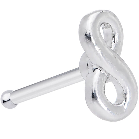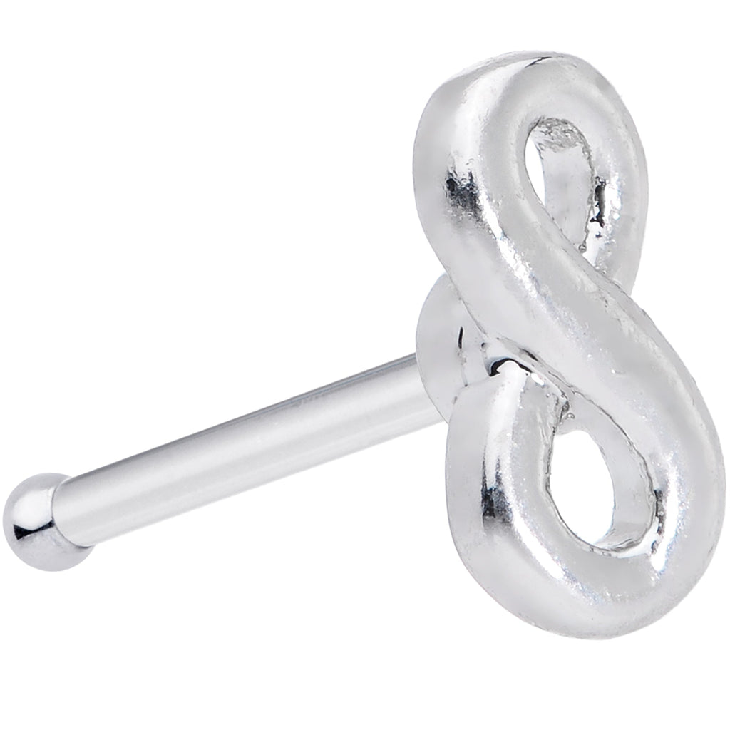 If your love of piercings will last until the end of time, this 20 gauge nose ring is perfect for you! It's made with an 8mm durable 316L surgical grade stainless steel straight post. It features a petite charm of a sideways figure 8, the symbol for infinity. This diminutive nostril jewelry shows the world that you'll love your nostril piercing forever...and then some!Specifications