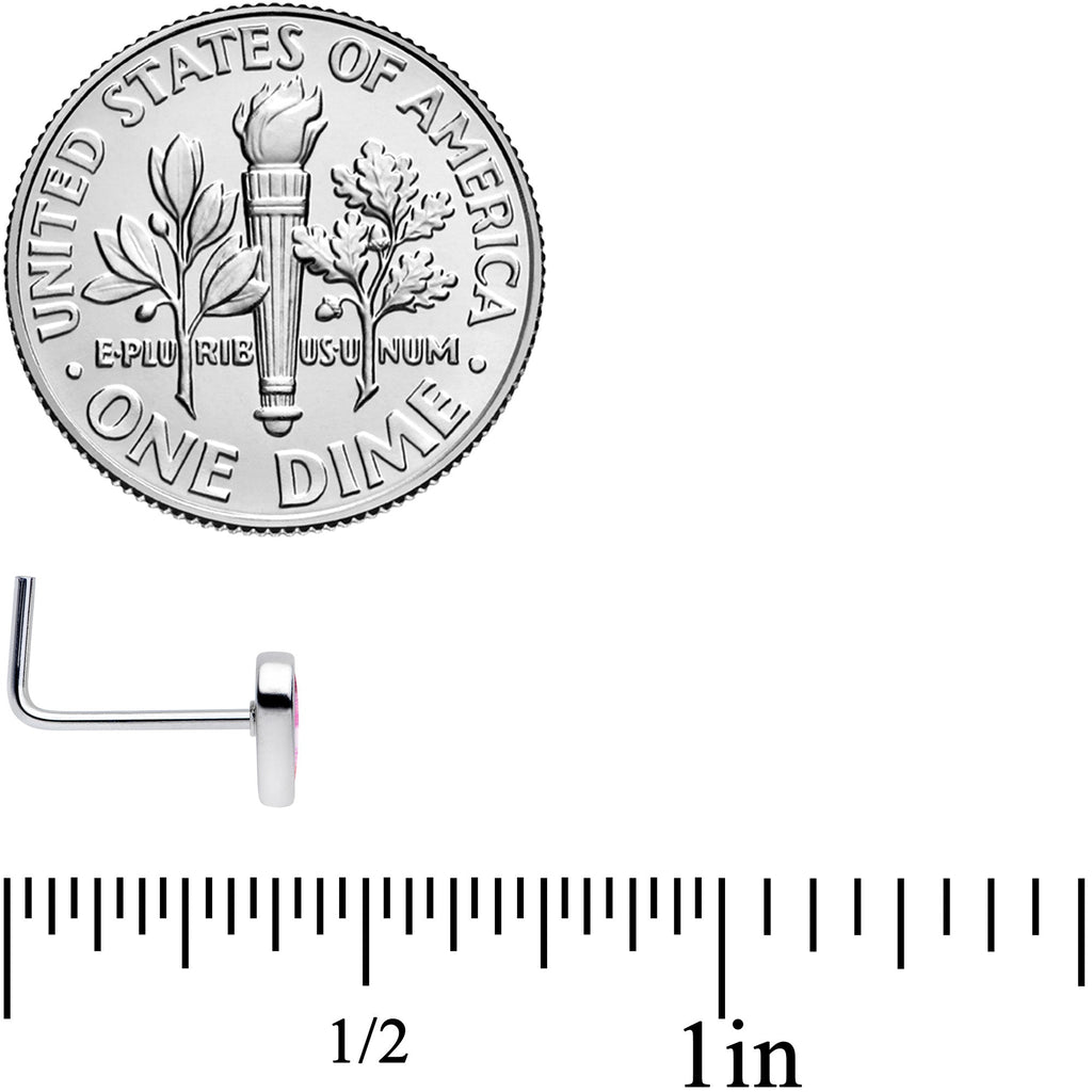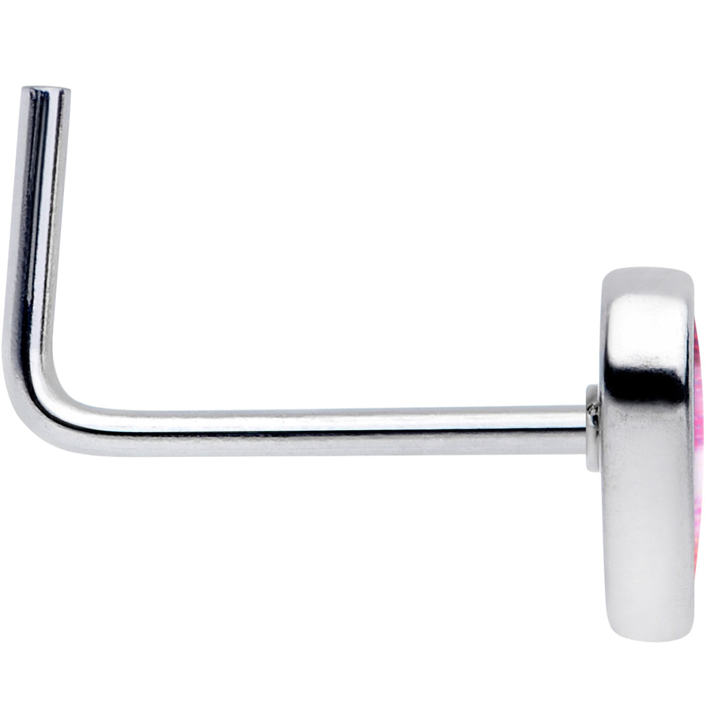Wear your pride on your sleeve...or in your nostril piercing with this 20 gauge nose jewelry. It's 8mm length at the bend and made with a 316L surgical grade stainless steel L-shaped post. The heart-shaped top end is inlaid with the lesbian pride flag. Whether you're an ally or want the world to see and hear your pride, meet the subject head-on with this pride-themed nose jewelry that supports equal rights for all!