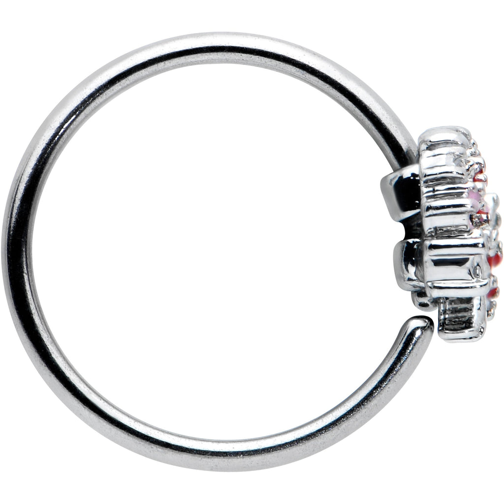 You'll have a look that's downright delicious with this 20 gauge nostril ring! It's made with an 8mm durable 316L surgical grade stainless steel circular ring. It features a tree charm, set with inlays in shades of pink and red, as well as white. Get a sweet and tasty look with this fabulous fruit tree nose piercing ring!Specifications