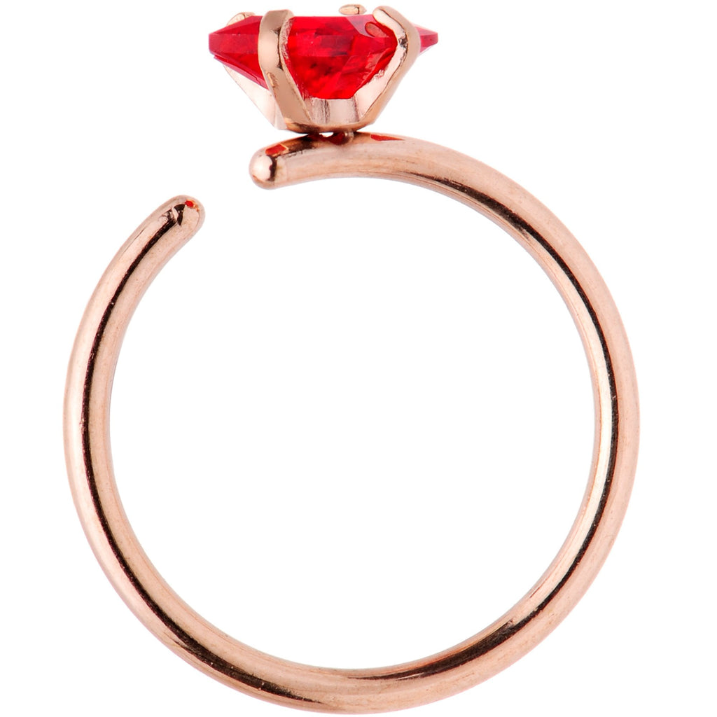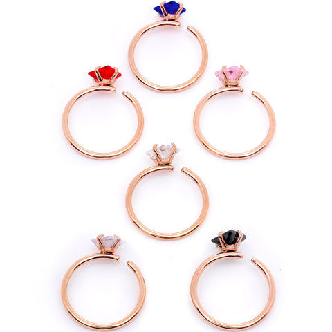 This set of 20 gauge nose rings gives you so many options, you might want to get a few more nostril piercings! The 8mm hoops are made with rose gold tone anodized over 316L surgical grade stainless steel and each one features a single rhombus-shaped gem. You get one each in clear, aurora, black, blue, red, and pink. You can match your outfit, your mood, the weather, or anything else that comes to mind! The only problem will be choosing which one to wear first! Sold as a set of six.