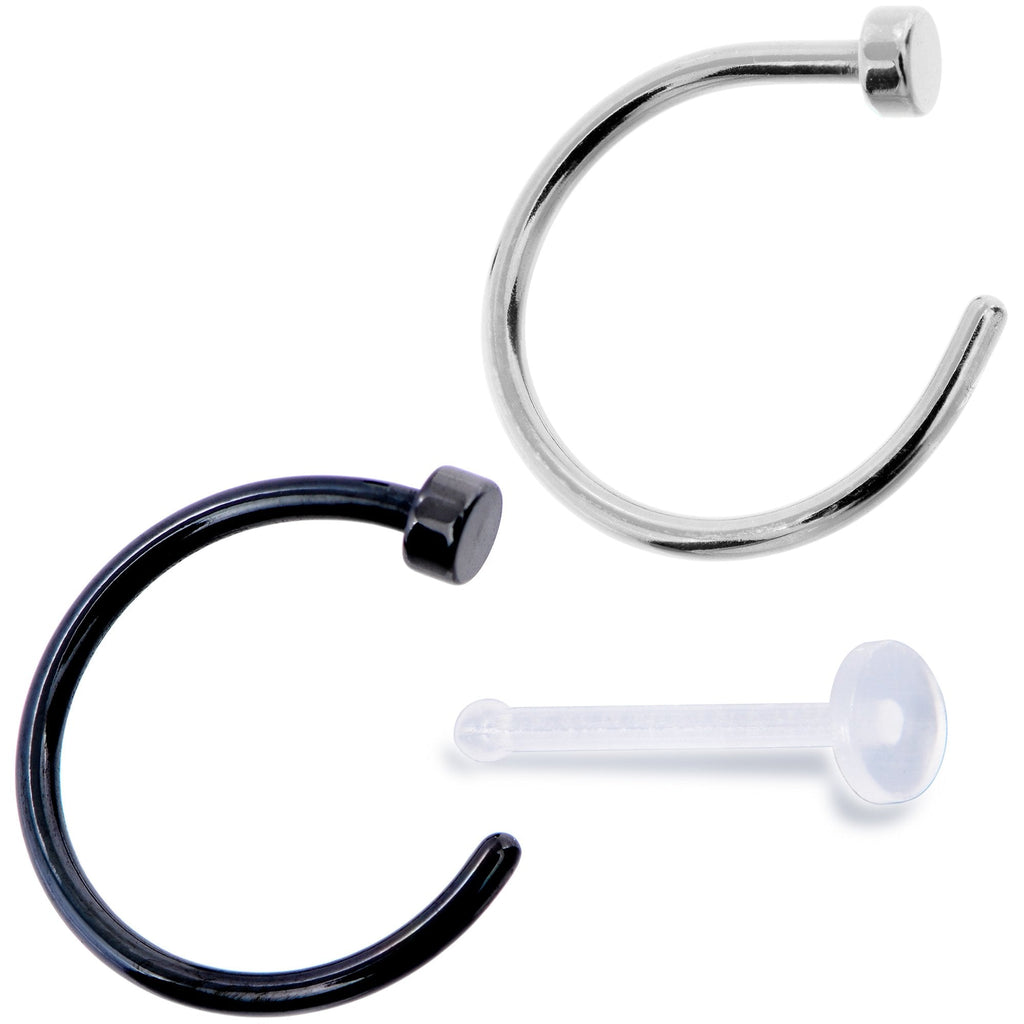 Tired of your old and boring nose jewelry? If you're looking to take your style up a notch without breaking the bank, this pack of two nose hoops is perfect for your body jewelry collection. Both nose rings are 20 gauge and have a hoop diameter of 8mm in size. In this pack you will receive two nose hoops: one black anodized, and one durable 316L surgical grade stainless steel nose hoop, as well as a bonus clear flexible bioplast retainer. Grab this pack for endless fashion options that will have everyone getting nosey.
