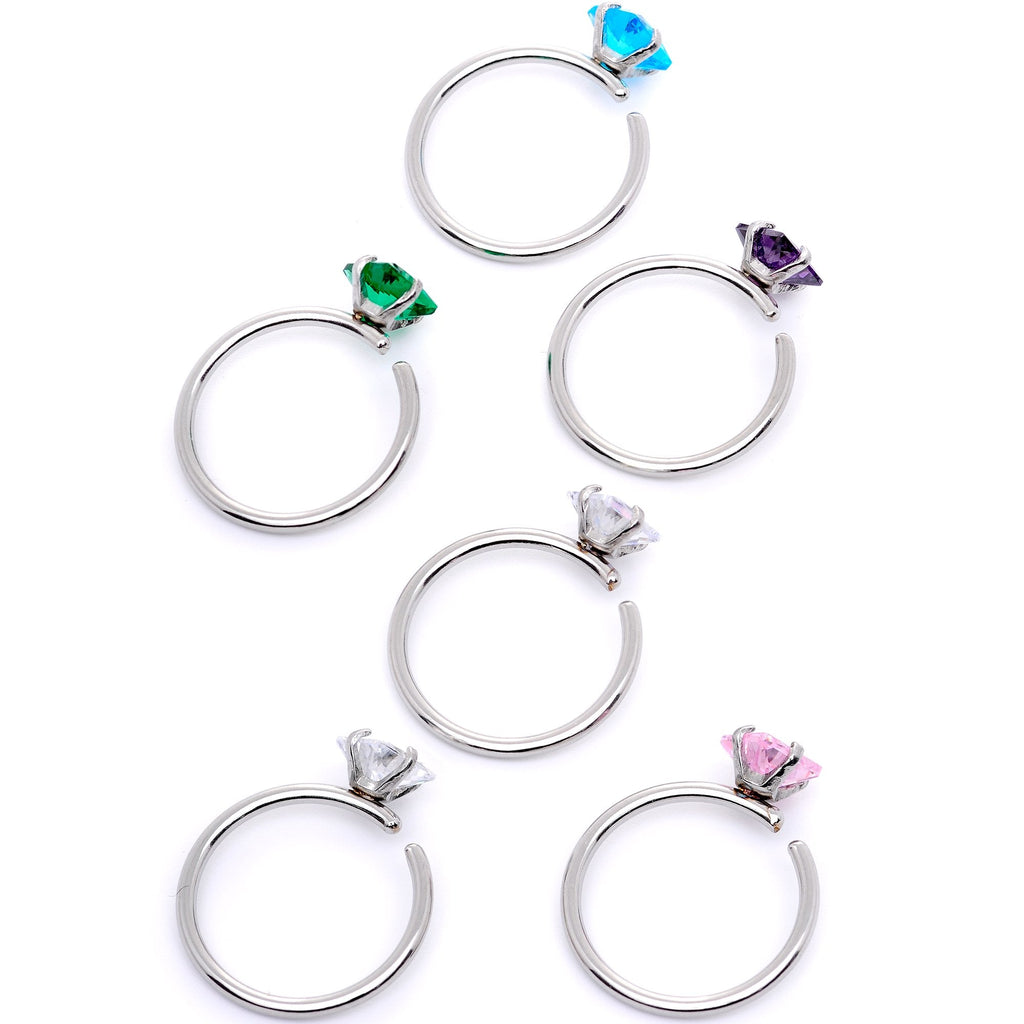 This set of 20 gauge nose rings gives you so many options you might want to get a few more nostril piercings! The 8mm hoops are made with durable 316L surgical grade stainless steel and each one features a single rhombus-shaped gem. You get one each in clear, aurora, purple, blue, green, and pink. You can match your outfit, your mood, the weather, or anything else that comes to mind! The only problem will be choosing which one to wear first! Sold as a set of six.Specifications