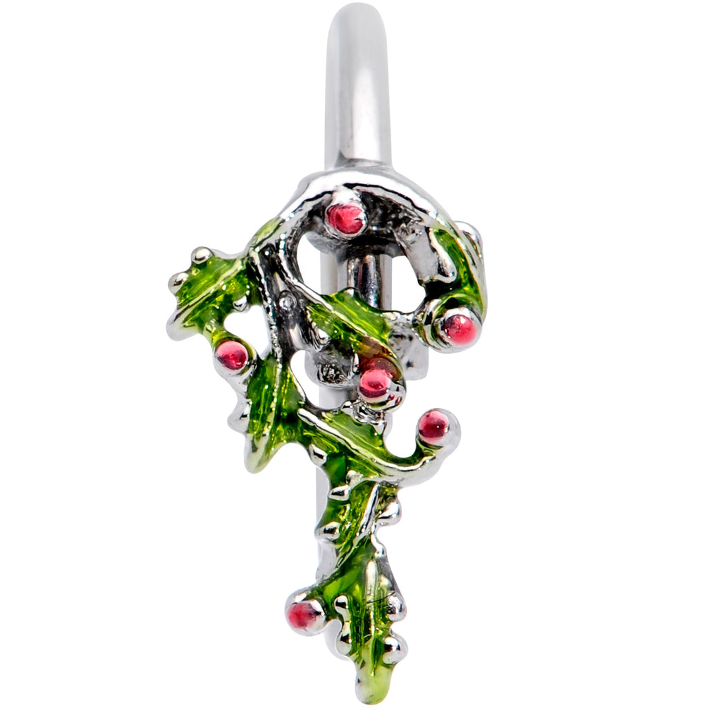 Bedeck your nostril piercing with Christmas candy on this 20 gauge nostril ring! It's made with an 8mm durable 316L surgical grade stainless steel circular ring. It features a candy cane charm, wound with a green strand of holly. The holly is embellished with pink cubic zirconia gems for a colorful replacement for holly berries! This candy cane is one that you'll want to keep around all year long!