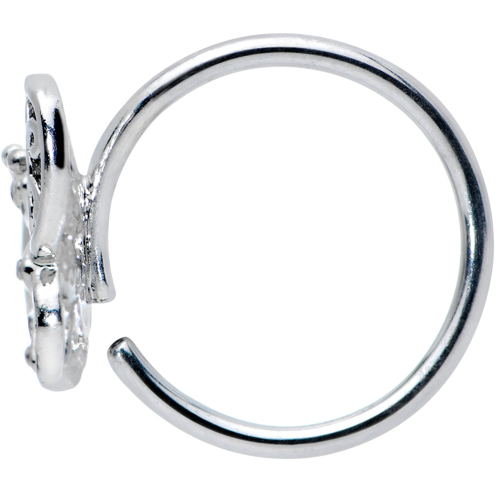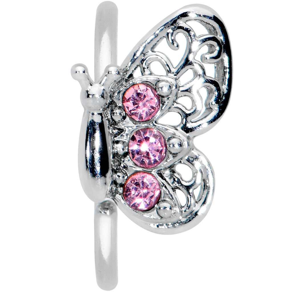 The butterfly on this 20 gauge nostril ring almost improves on nature itself! It's made with an 8mm durable 316L surgical grade stainless steel circular ring and features a butterfly charm, set along the wing with pink gems that can't help but catch the eye of any onlooker. The butterfly's wing is open work with lacy patterns running through for a look that's elegant. Let your nostril piercing come out of its cocoon with this visually striking butterfly nose jewelry!Specifications