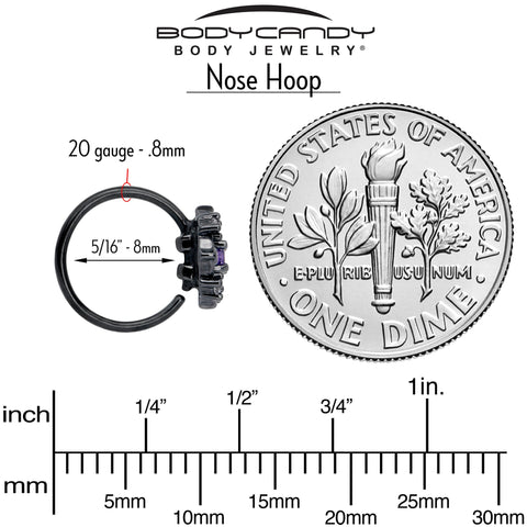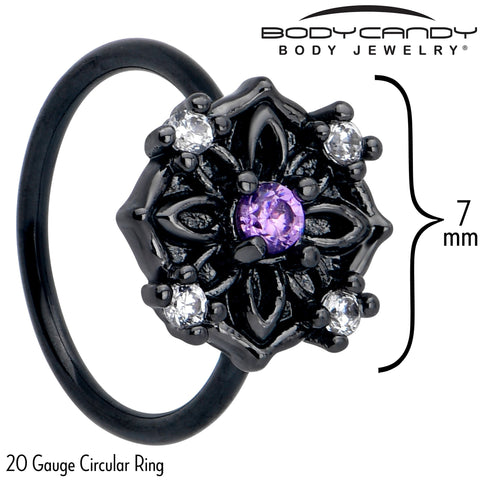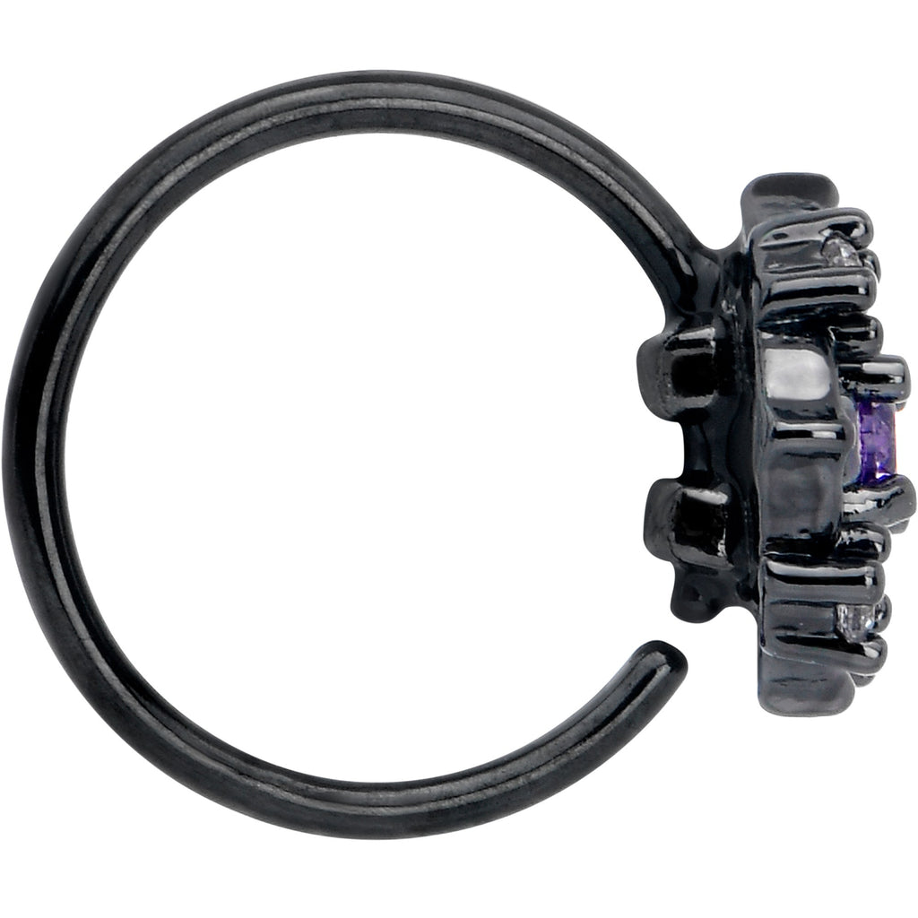 20 Gauge 5/16 Purple CZ Gem Black Flower Ring Nose Hoop