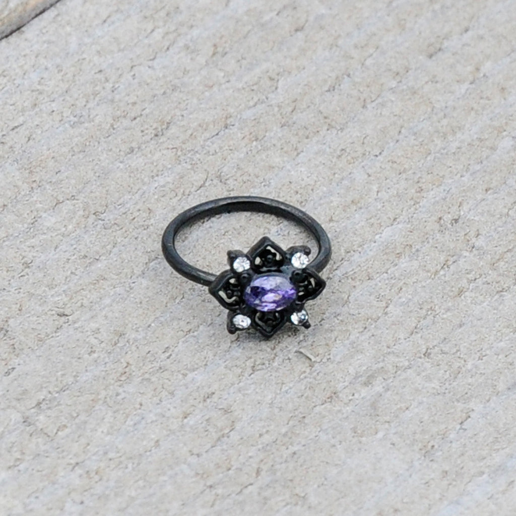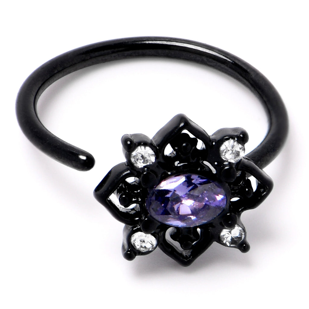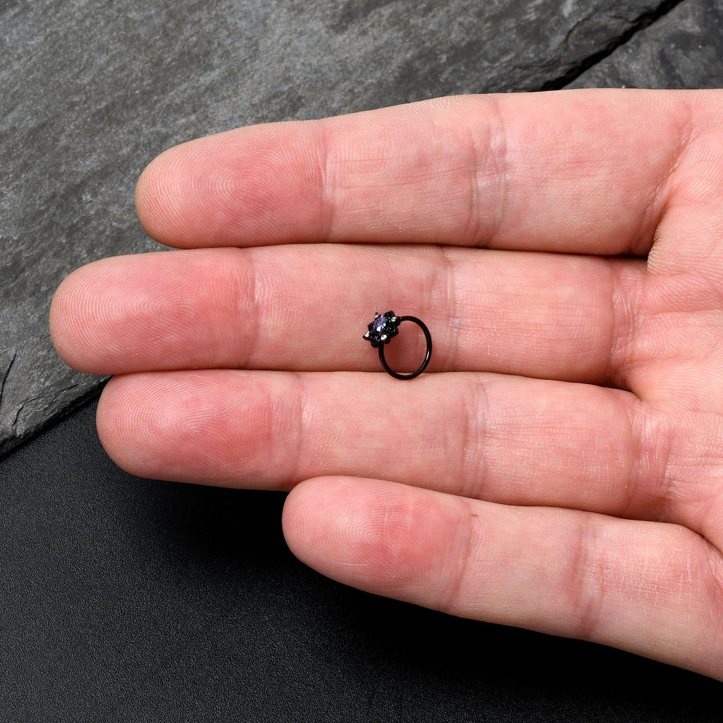 Fall in love with a goth new look, like on this 20 gauge nostril ring. It is made with an 8mm black PVD over 316L surgical grade stainless steel circular ring. It features an oval charm, with a purple gem center. It is further embellished with scrollwork hearts, with a clear gem set between each one. Let your inner goth come out to play with this darkly divine nose piercing ring.Specifications