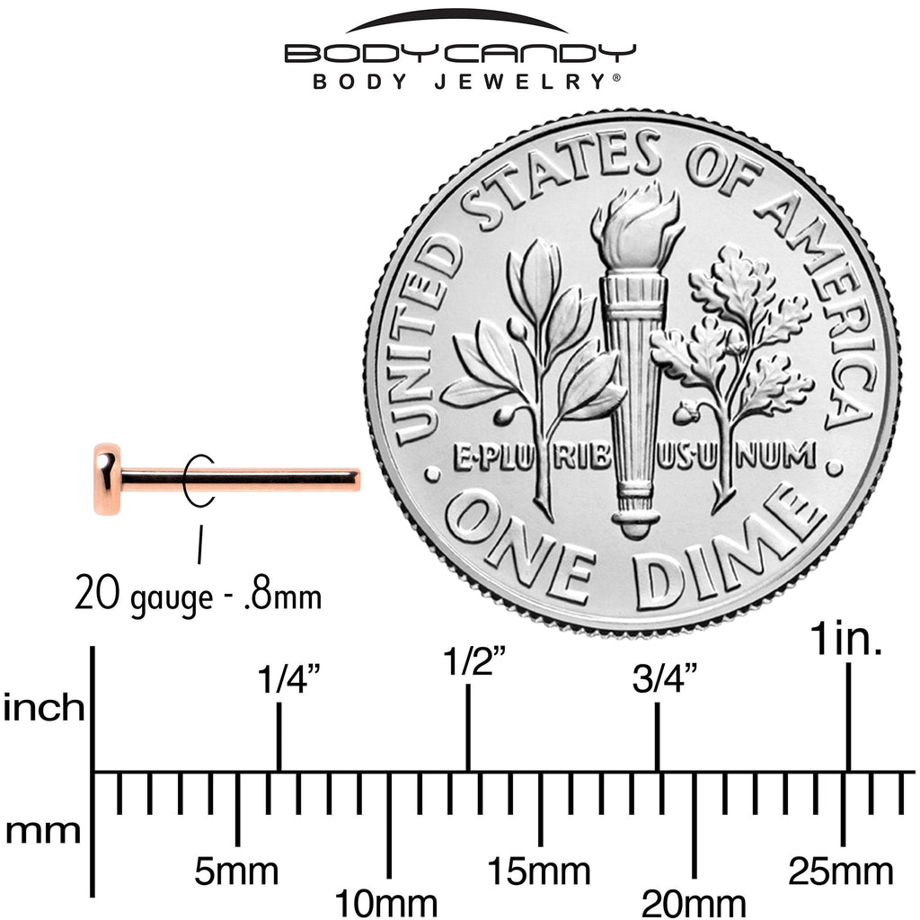 Cover your basics with quality and endless style options when you're rocking this 20 gauge labret stud. It's made with an 8mm rose gold tone PVD over ASTM F-136 titanium (solid medical grade titanium) post. It features a threadless design, making insertion and removal a breeze. The threadless design also allows you to easily change the ends, making for a virtually infinite number of style options. This cartilage ring does not come with an end, and you can rock it in multiple piercings including lip, monroe, tragus, helix, and some nose piercings. Start your look from the ground up with this threadless labret post.Specifications