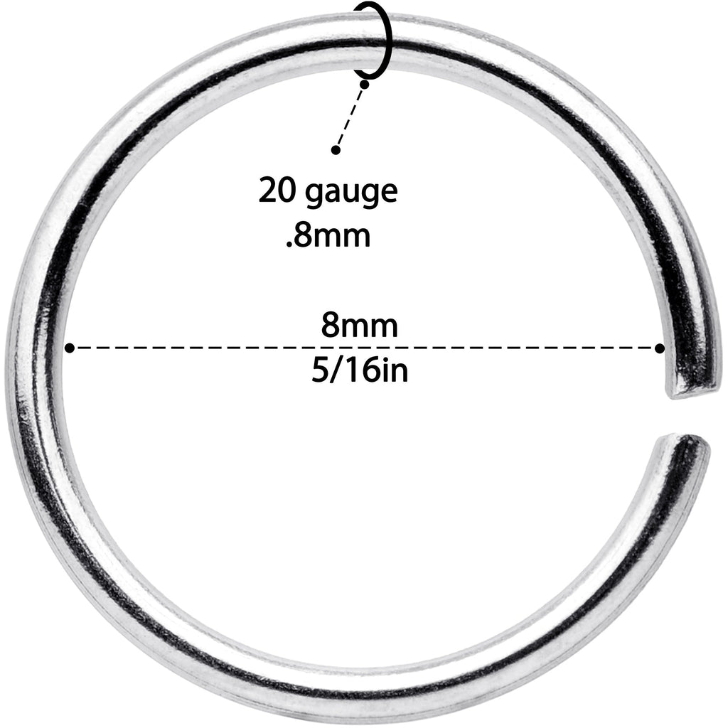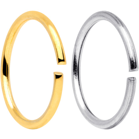 Whether you have multiple nostril piercings and prefer a matching look or are simply prone to losing things, this set of 20 gauge nose rings has you covered. Six are made with 8mm gold tone anodized over 316L surgical grade stainless steel seamless circular rings, for a classically elegant look. You also get six made with 8mm durable 316L surgical grade stainless steel seamless circular rings for a traditional appearance. This nostril jewelry is super easy to insert and remove - simply twist the ring open, insert, and then twist gently shut again. And with so many in the set, you can be sure of always having a beautiful nose ring to wear! Sold as a set of twelve. These are universal seamless rings for multiple body piercings including ear, lip and septum or nose.Specifications