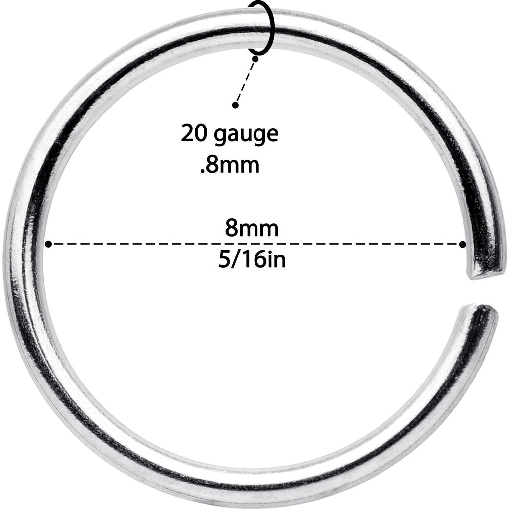 Whether you have multiple nostril piercings and prefer a matching look or are simply prone to losing things, this set of 20 gauge nose rings has you covered. Six are made with 8mm rainbow anodized over 316L surgical grade stainless steel seamless circular rings, for a cheerful, modern look. You also get six made with 8mm durable 316L surgical grade stainless steel seamless circular rings for a traditional appearance. This nostril jewelry is super easy to insert and remove - simply twist the ring open, insert, and then twist gently shut again. And with so many in the set, you can be sure of always having a beautiful nose ring to wear! Sold as a set of twelve. These are universal seamless rings for multiple body piercings including ear, lip and septum or nose.