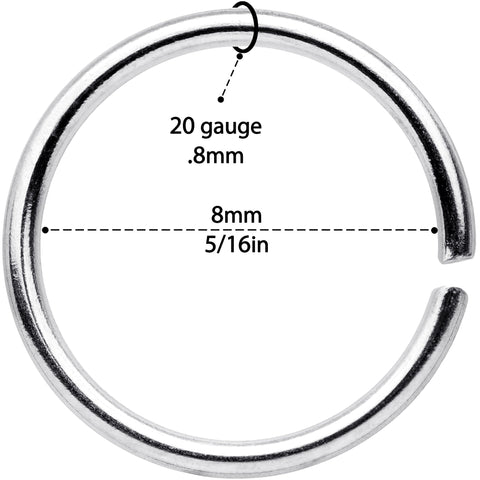 Whether you have multiple nostril piercings and prefer a matching look or are simply prone to losing things, this set of 20 gauge nose rings has you covered. Six are made with 8mm rose gold tone anodized over 316L surgical grade stainless steel seamless circular rings, for a modern and stylish look. You also get six made with 8mm durable 316L surgical grade stainless steel seamless circular rings for a traditional appearance. This nostril jewelry is super easy to insert and remove - simply twist the ring open, insert, and then twist gently shut again. And with so many in the set, you can be sure of always having a beautiful nose ring to wear! Sold as a set of twelve. These are universal seamless rings for multiple body piercings including ear, lip and septum or nose.Specifications