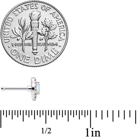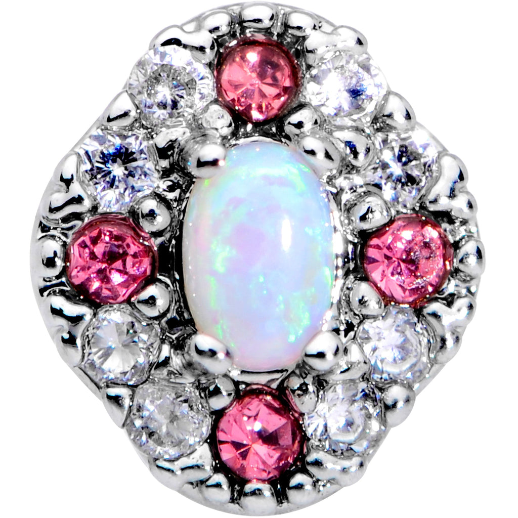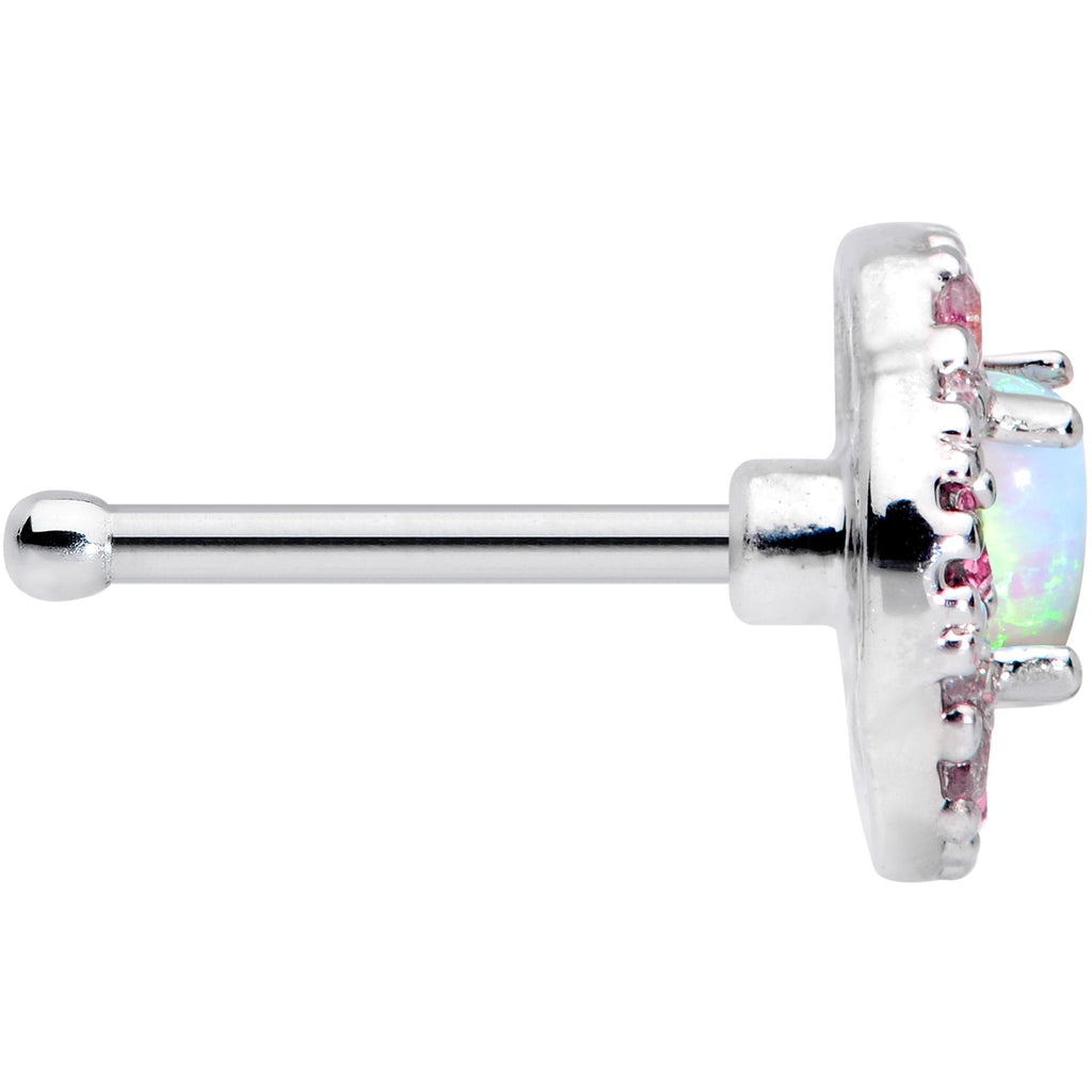 The oval on this 20 gauge nostril ring will have you saying "oh wow"! It's made with an 8mm durable 316L surgical grade stainless steel straight post. It features an oval charm with a white synthetic opal set at the center. It's surrounded by alternating pink and clear gems for a look that's opulent and very on-trend. Give your look some added glamour with this gorgeously opulent oval-themed nose piercing ring!Specifications