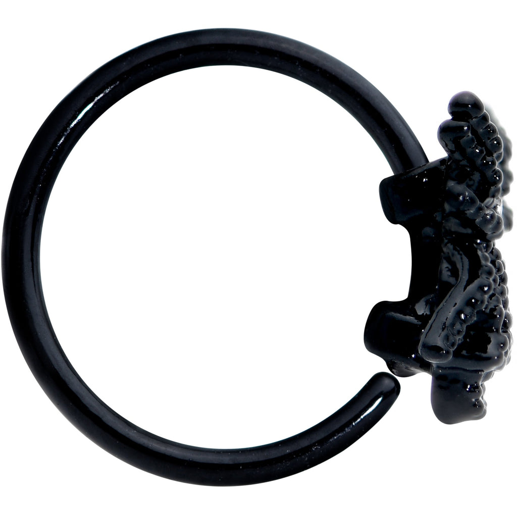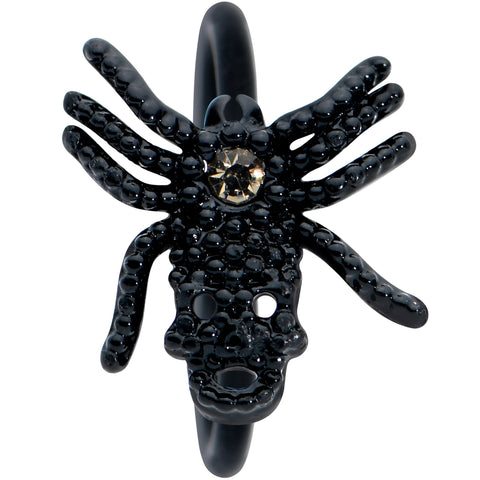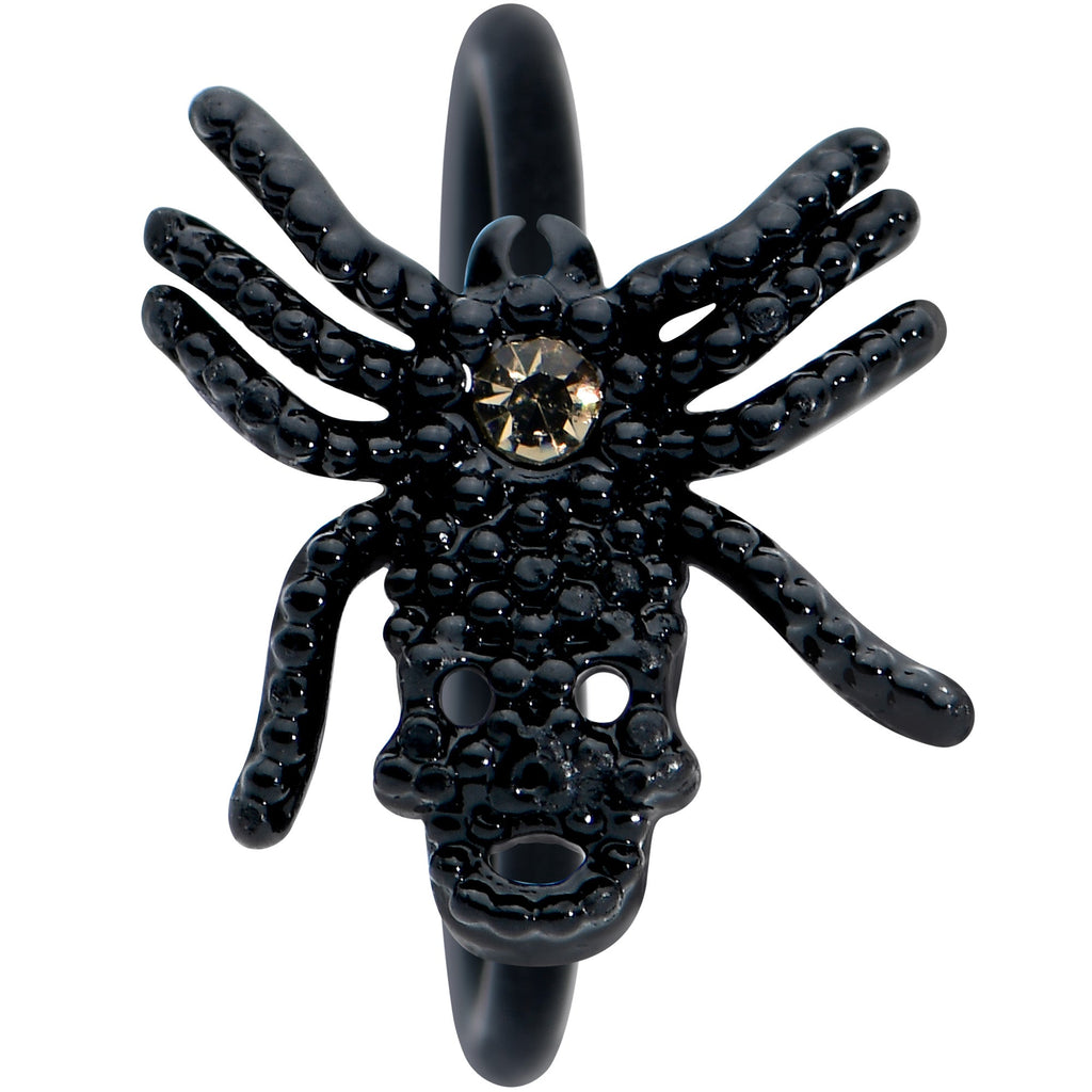 This creepy crawly critter has found a new home on this 20 gauge nostril ring! It's made with an 8mm black PVD over 316L surgical grade stainless steel circular ring and features a large black spider charm. The spider has a black textured detailing on its body and a smoky yellow gem at the center, to draw the eye in a way that's subtle but impossible to ignore. So don't ignore this creepy critter, let it crawl into your nose piercing and spin a web of beauty!Specifications