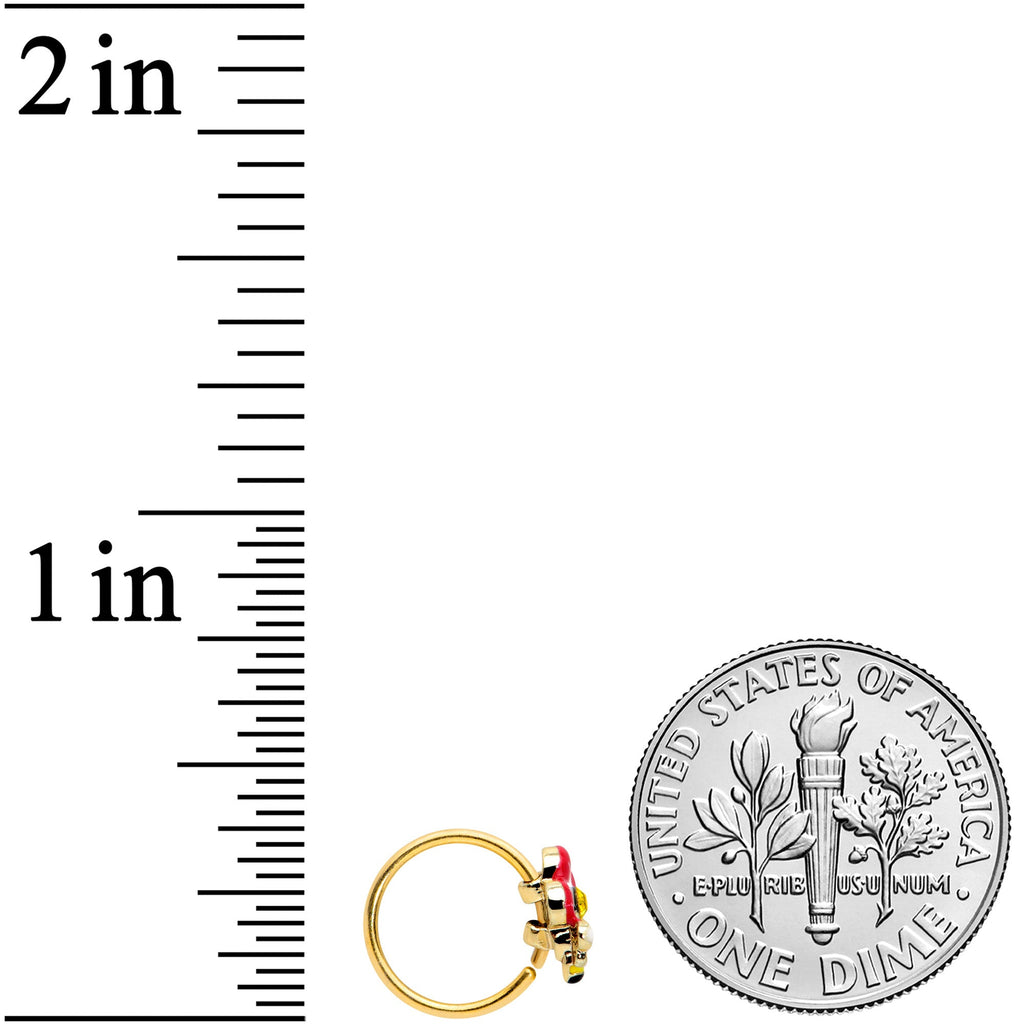 Let your nose piercing feel like a queen bee with this 20 gauge nostril ring. It's made with an 8mm gold tone plated over 316L surgical grade stainless steel circular ring that features a flower charm with red and white petals and a yellow gem center. The flower is embellished with a queen bee perched on it, identifiable by the red dot on her back. Feel like the queen of the hive with this charming floral nostril piercing ring!Specifications