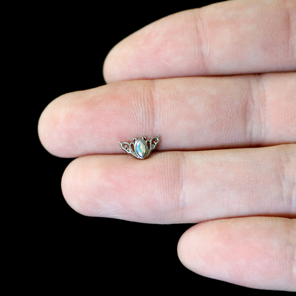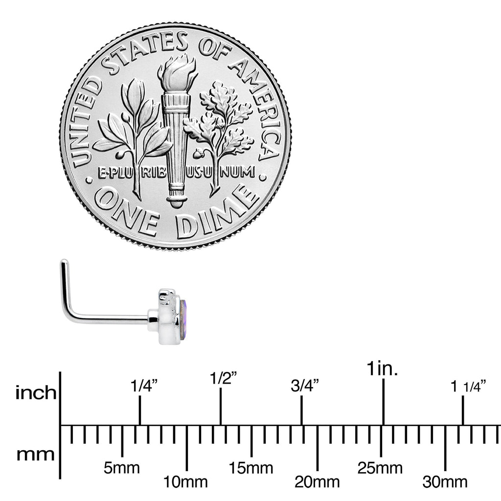 Ride a wave of style with this 20 gauge nostril ring! It's made with a .27" length at the bend 316L surgical grade stainless steel L-shaped post.It features an Art Deco charm of waves and scrolls. Set at the center is an oval shaped aurora gem that adds a classic touch of color and glamour to a timeless look. You'll be waving hello to a whole new look with this sleek and timeless nose piercing jewelry.Specifications