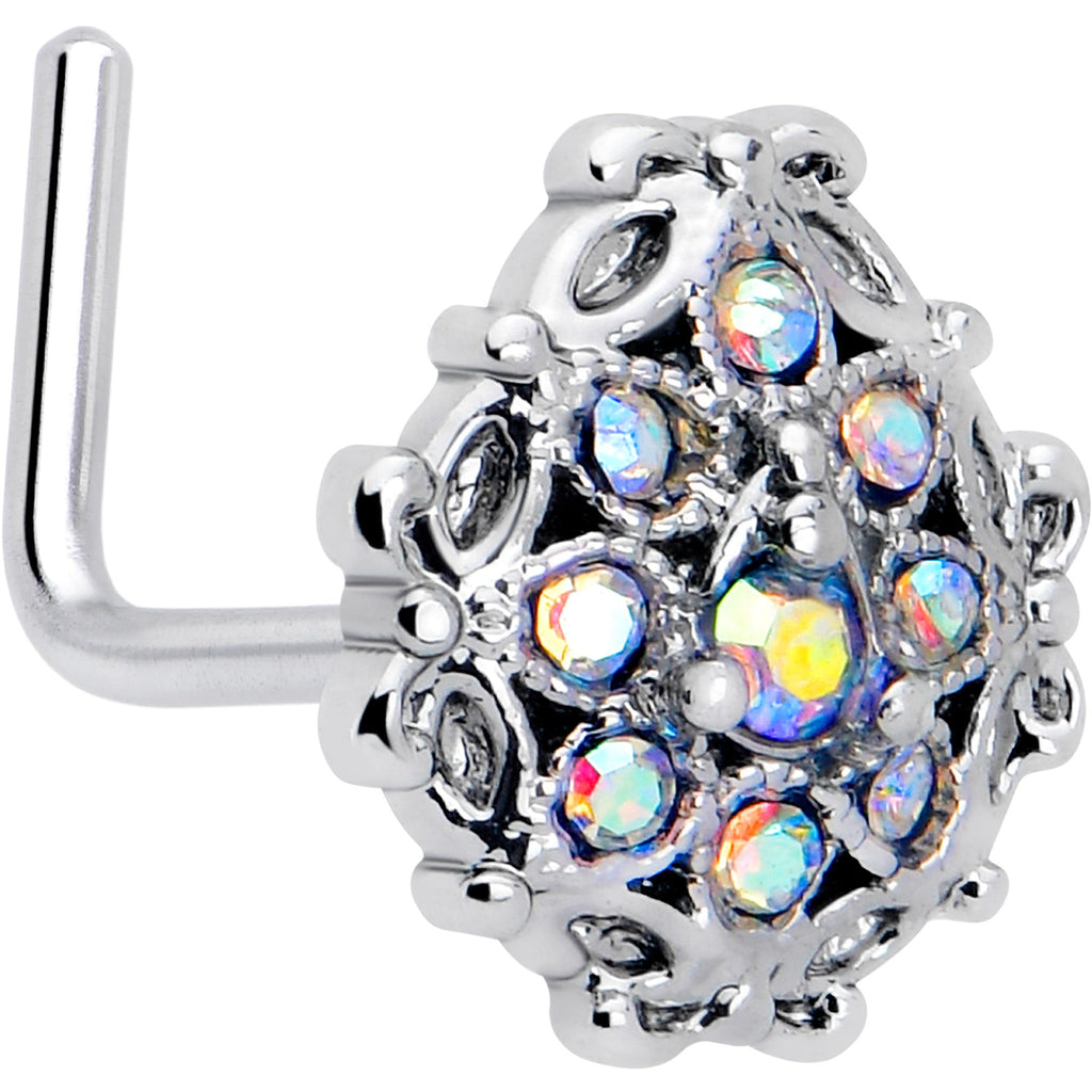 You may need to shield your eyes from the fierce glamour radiating from this 20 gauge nostril ring. It's made with a 0.27 inch length at the bend 316L surgical grade stainless steel L-shaped post. It features an art-deco inspired cluster of small aurora gems around a large drop shaped aurora gem. The look is both simple and strikingly dramatic, with a sumptuous look that's impossible to ignore. Take glamour to a whole new level with this alluringly opulent nose piercing jewelry.Specifications
