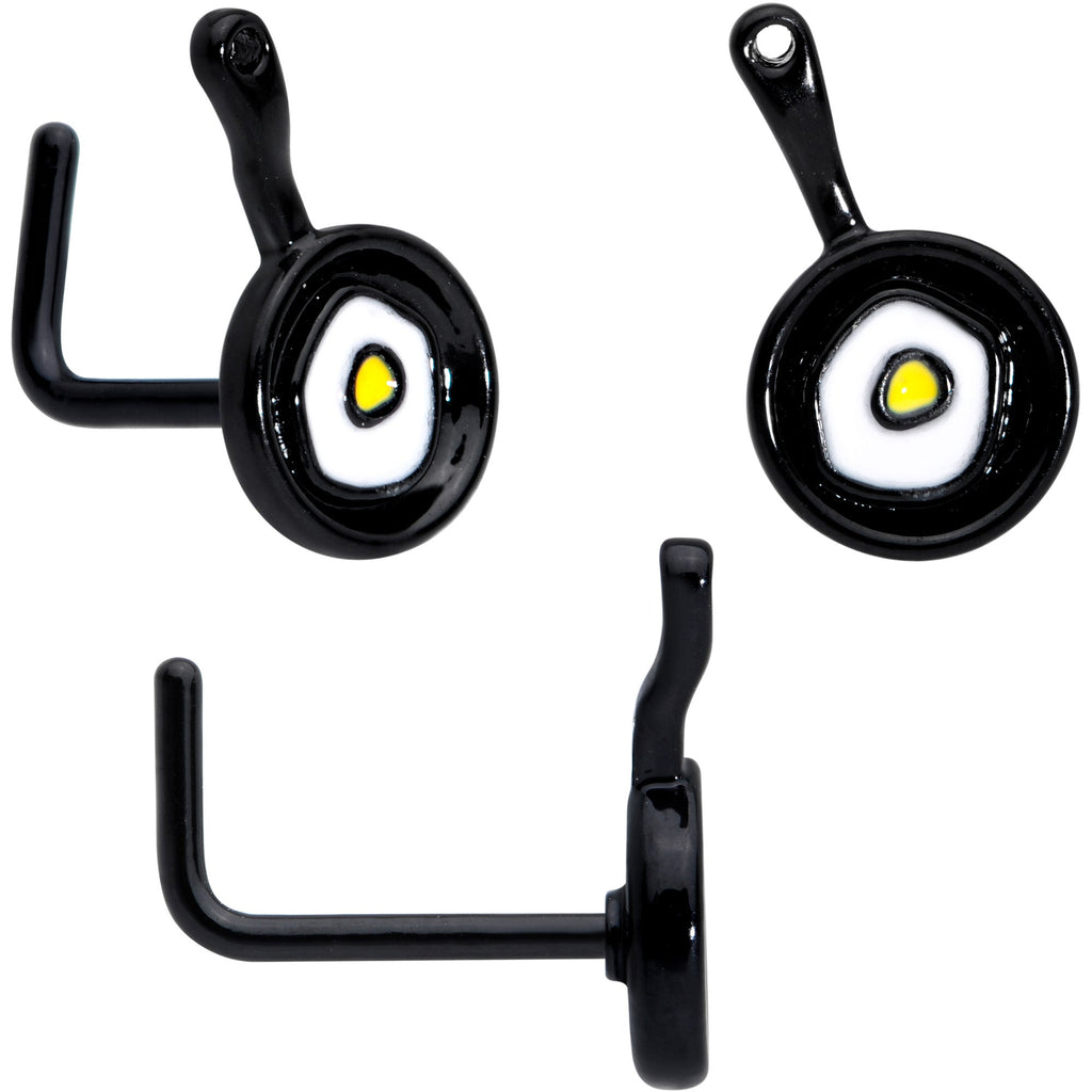 Now the cook can be hotter than the kitchen with this set of 20 gauge nostril jewelry! They're both made with 7mm length at the bend black PVD over 316L surgical grade stainless steel L-shaped posts. Each one features a different cooking-themed charm. One features a spatula charm, with open work detailing and red on the handle for a touch of realism. The other one features a frying pan charm, complete with an egg frying inside! It's a whole new recipe for looking delicious when you're rocking these chef-themed nose piercing rings! Sold as a set of two.Specifications