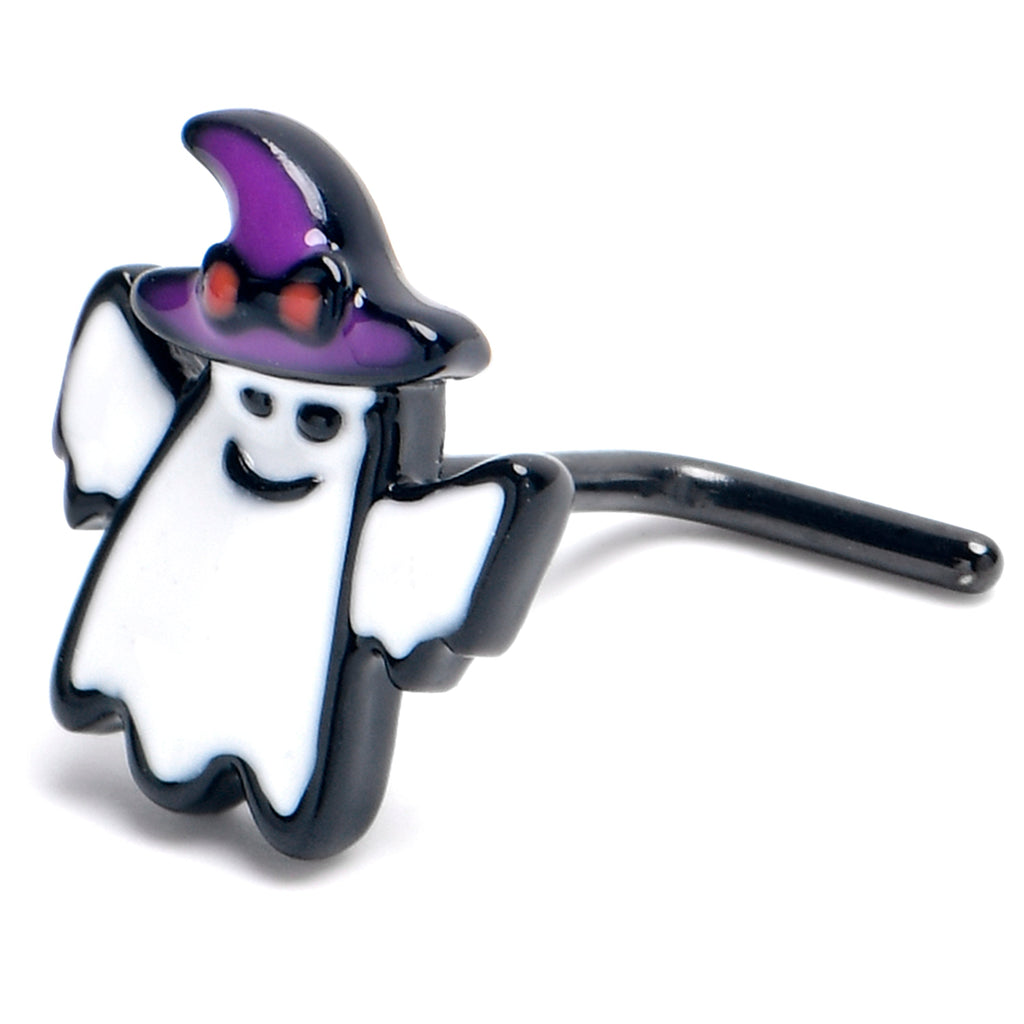 The ghost on this 20 gauge nostril ring is sure to cast a spell on you. It is made with a .27 inch length at the bend black PVD over 316L surgical grade stainless steel L-shaped post. It features a ghost charm, wearing a purple witch's hat with raised orange embellishment. This witchy ghost nose piercing jewelry is absolutely haunting.Specifications