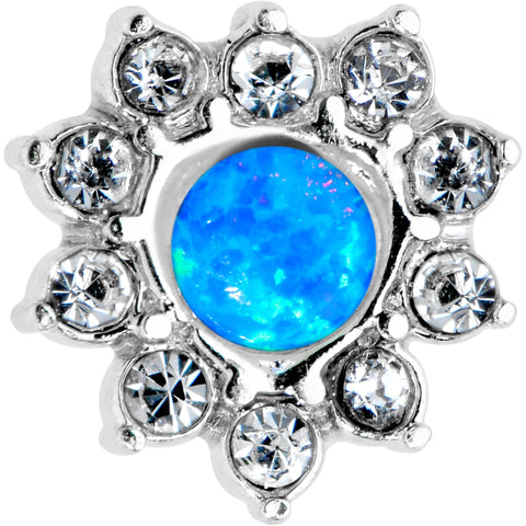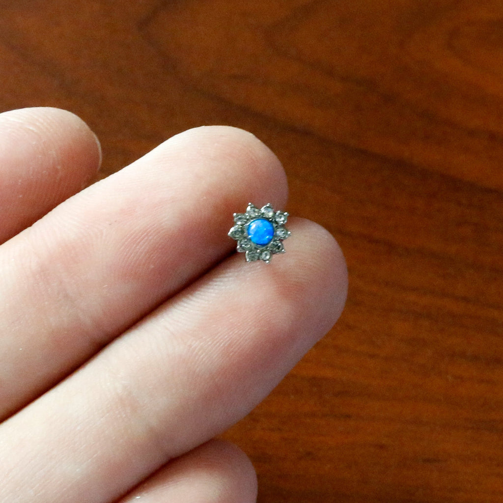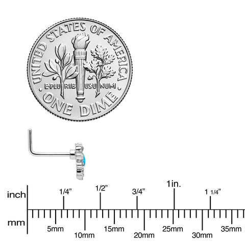 Add some sun and some love to your day with this 20 gauge nostril ring! It's made with a .27" length at the bend 316L surgical grade stainless steel L-shaped post. It features a sun charm, with each ray set with a clear cubic zirconia gem. Within the center of the sun is a blue faux opal orb. Brighten up your nose piercing with a sunny nose ring you can't help but fall in love with!Specifications