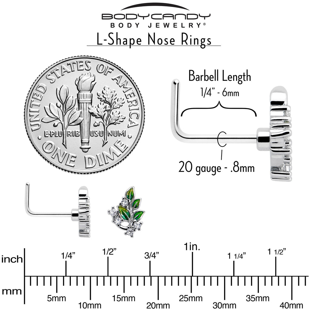 Let your look shine like the leaves in the morning with this 20 gauge nostril ring. It's made with a 0.27 inch length at the bend 316L surgical grade stainless steel L-shaped post. It features a green inlaid leaves charm, set among clear cubic zirconia gems for a look reminiscent of the morning dew. Let your look turn over a new leaf of elegance with this lovely, leafy nose piercing jewelry.Specifications