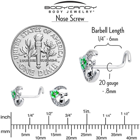 The little bunny on this 20 gauge nostril ring has gone exploring new realms. It's made with a 0.27 inch length at the bend 316L surgical grade stainless steel straight post which is designed for a left side piercing. It features a crescent moon charm, paved with clear cubic zirconia gems. Sitting on the moon is a rabbit, with simple detailing and a black eye embellishment. The moon is further embellished with a green flower. Fall down a rabbit hole of style with this celestial bunny nose piercing jewelry.Specifications