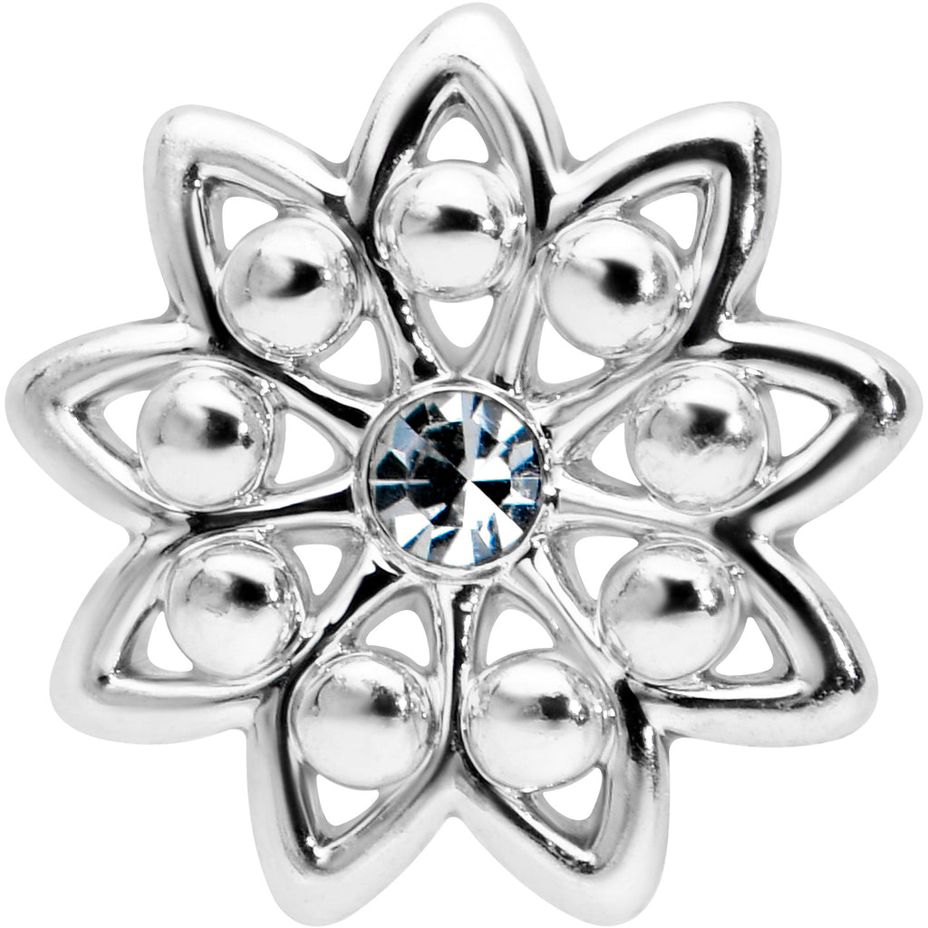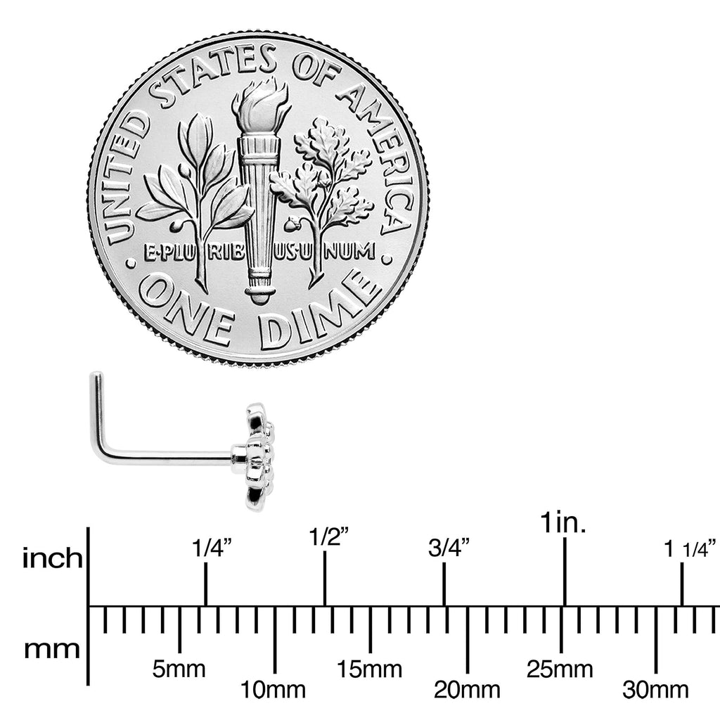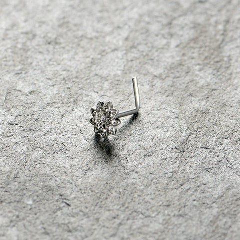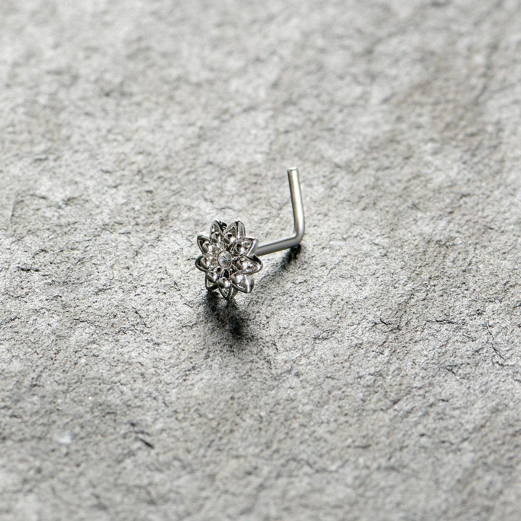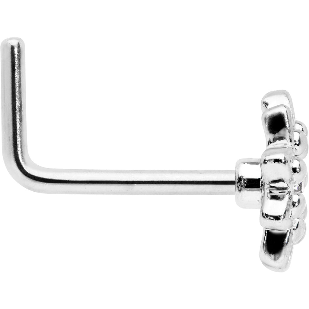 Some flowers are meant to be stars, like this 20 gauge nostril ring! It's made with a .27" length at the bend 316L surgical grade stainless steel L-shaped post. It features a detailed flower charm, with petals featuring textured detailing and the flower is set at the center with a clear gem for stunning color contrast. Let your piercings bloom like the stars they are when you're rocking this striking starry flower nose piercing jewelry.Specifications