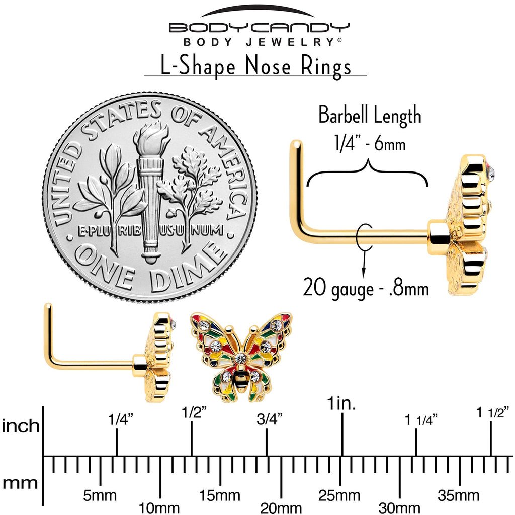 The butterfly on this 20 gauge nostril ring is rocking all the color and style you could possibly want. It's made with a 0.27 inch length at the bend gold tone PVD over 316L surgical grade stainless steel L-shaped post. It features a butterfly charm. The butterfly has wings inlaid in shades of red, yellow, and green with color block styled detailing. It is further embellished with clear gems. Grab your paintbrush and spread your wings, it is time for colorful style with this beautiful butterfly nose piercing jewelry.Specifications