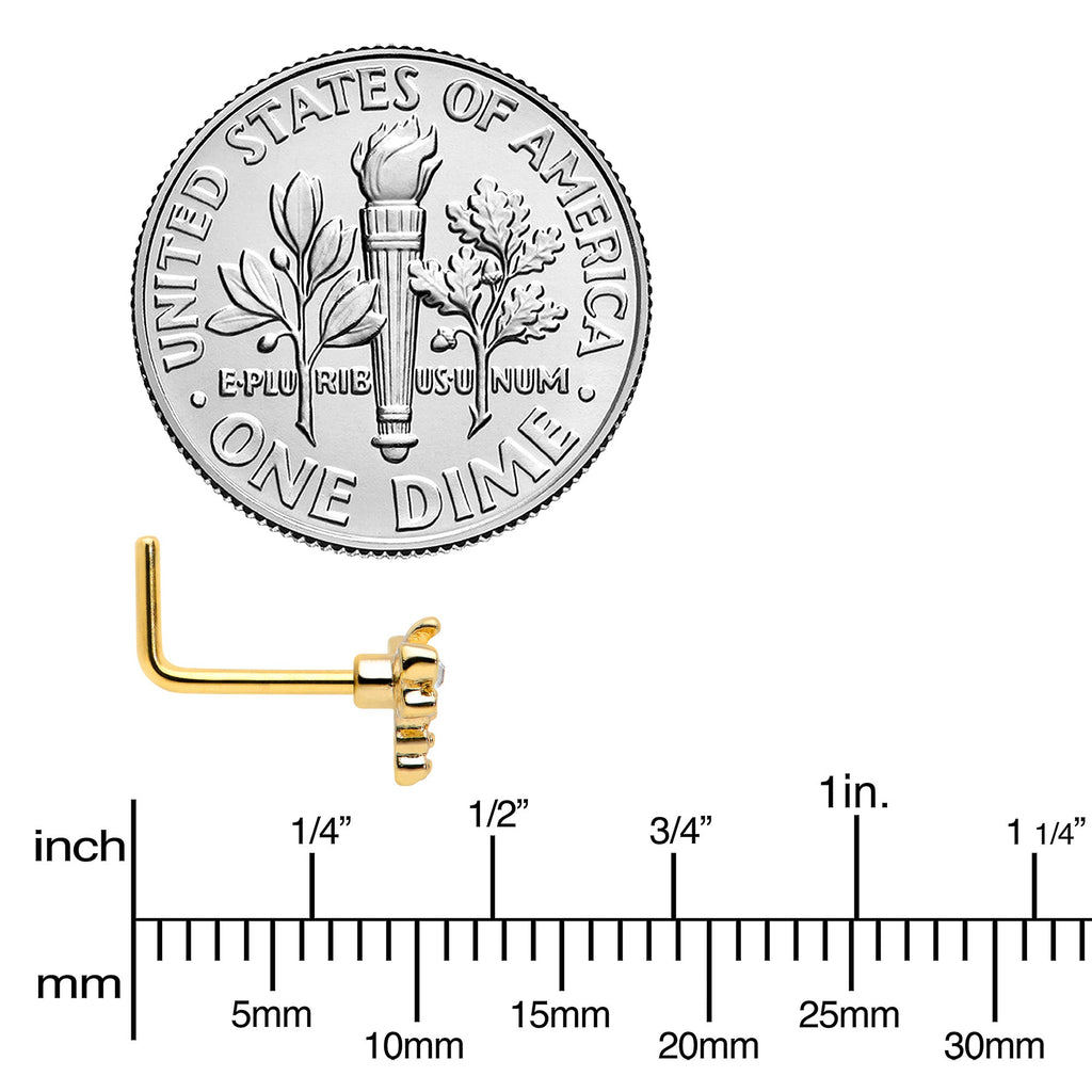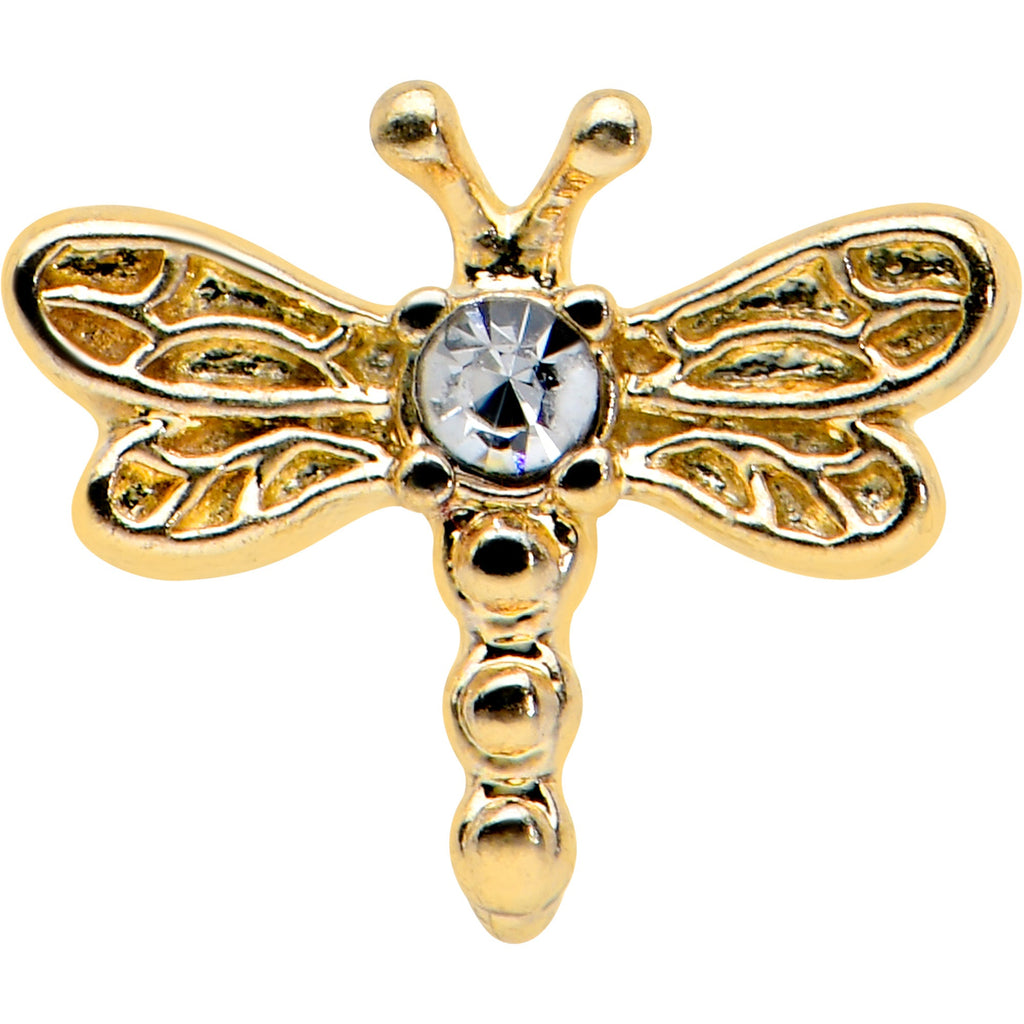 Let your look soar with this 20 gauge nostril ring! It's made with a .27" length at the bend gold tone PVD over 316L surgical grade stainless steel L-shaped post. It features a dragonfly charm. The dragonfly features openwork wings and a body that's set with a small clear gem. You'll want to fly too when you're rocking this darling, dragonfly nose piercing jewelry!