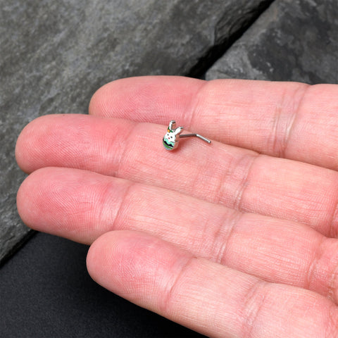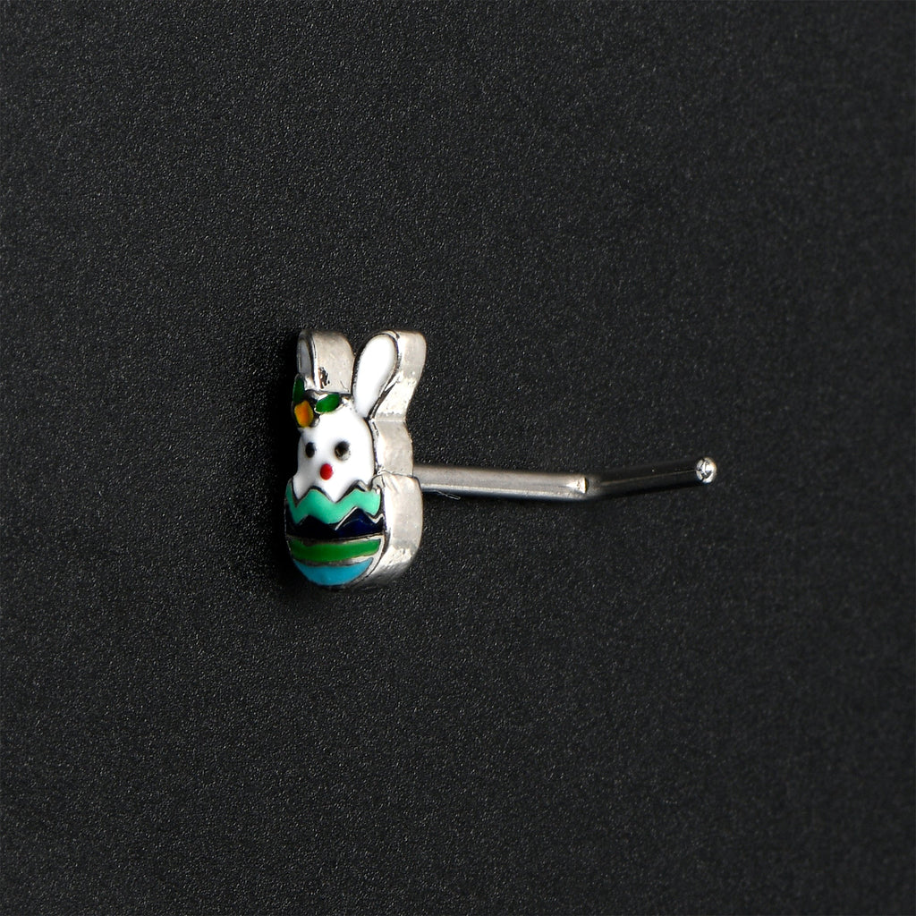 Hatch a new look with this 20 gauge nostril ring. It is made with a .27 inch length at the bend 316L surgical grade stainless steel L-shape post. It features a bunny rabbit charm, inlaid in white with simple features. The bunny has a green inlay ornament on one ear and is hatching from a green, blue, and black inlaid Easter egg for a sweetly colorful appearance. You will want to hop to it and snatch up this adorable Easter rabbit nose piercing ring.Specifications