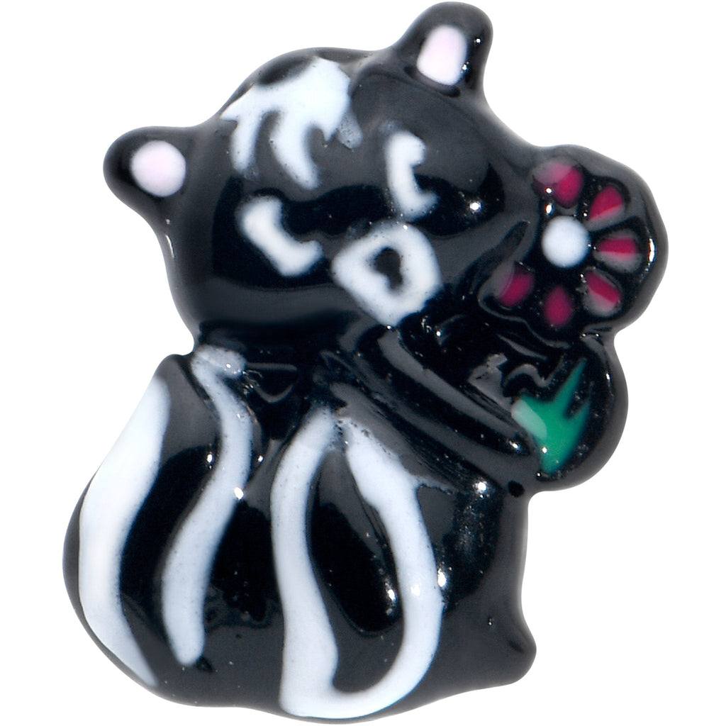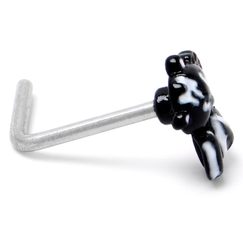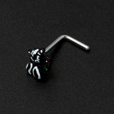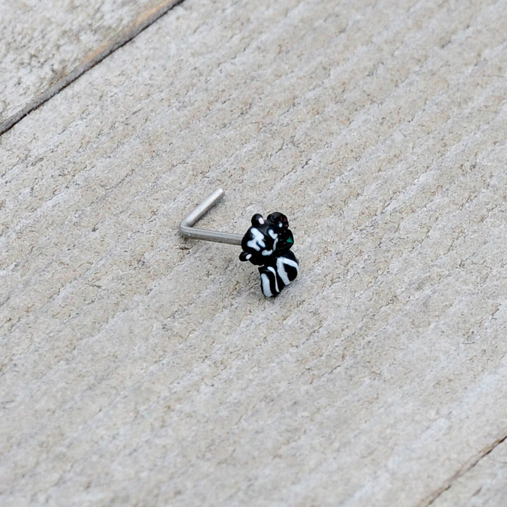 Get funky with the skunky on this 20 gauge nostril jewelry. It is made with a .27 inch length at the bend 316L surgical grade stainless steel L-shaped post. It features an adorable skunk charm. The skunk features black and white inlay and is clutching a red inlaid flower for an extra sweet appearance. You will fall in love with the little stinker on this sweetheart skunk nose piercing ring.Specifications
