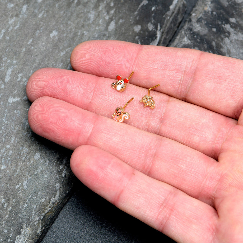 Let all the creatures of the fields come play when you're rocking these 20 gauge nostril rings. They are made with 0.27 inch length at the bend gold tone PVD over 316L surgical grade stainless steel L-shaped posts. One features a stylized squirrel charm in pink and white with inlaid details. The second features a mouse charm with red embellished ears for a bright pop of color. The third features a sheep charm with textured embellishment. Frolic in the fields with this adorable animal nose piercing jewelry. Sold as a set of three.Specifications