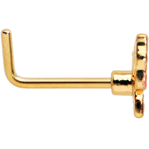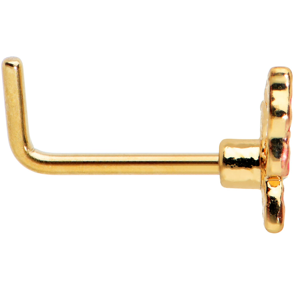 Keep it simple while keeping it stylish with this 20 gauge nostril ring! It's made with a .27" length at the bend gold tone PVD over 316L surgical grade stainless steel L-shaped post. It features a butterfly charm, done in an openwork style. The butterfly features pink embellishments for added color and style. This nose piercing ring proves that simple never has to mean boring!Specifications
