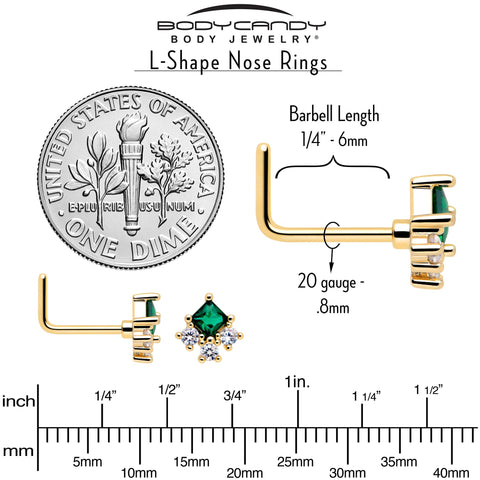 Your look is sure to be a hit when you are rocking this 20 gauge nostril ring. It is made with a 0.27 inch length at the bend gold tone PVD over 316L surgical grade stainless steel L-shaped post. It features an elegant rhombus charm, with a deep green cubic zirconia gem center and a trio of clear cubic zirconia gem embellishments for a color contrast you can not take your eyes off of. Make an impact with this elegant rhombus nose piercing jewelry.Specifications