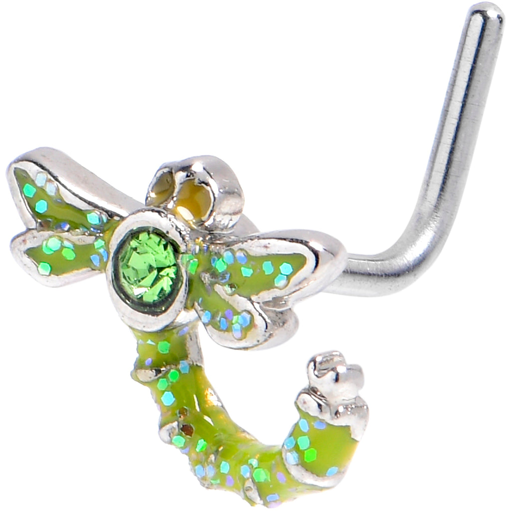 Get ready to add some glittery glam to your look with this 20 gauge nostril ring. It's made with a .27 inch length at the bend 316L surgical grade stainless steel L-shaped post. It features a dragonfly charm, inlaid with green glitter for a look you can't miss. It's further embellished with a green gem on its back. Spread your wings into style with this gorgeous, glitter dragonfly nose piercing jewelry.Specifications